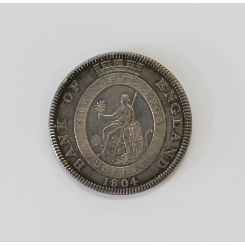 A BANK OF ENGLAND DOLLAR PIECE. A George 111 1804 dated Dollar Piece, stops in truncation and after rex. See Illustration