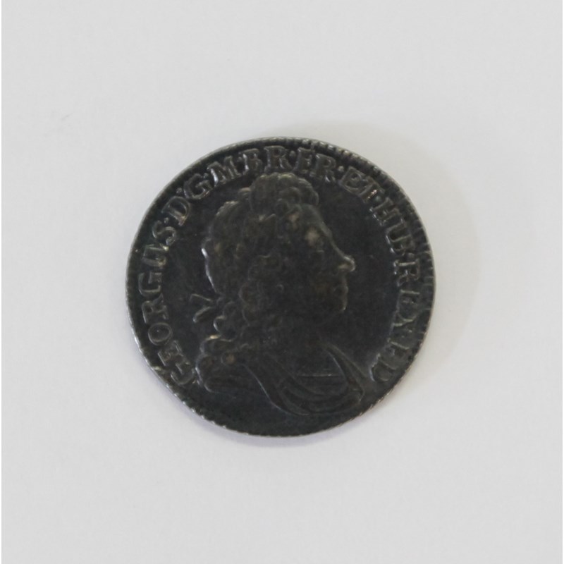 A George 1 Shilling piece dated 1723, with SSC in the angles. There is a minting flaw to the lower shield on the reverse, at 07:00 hrs.