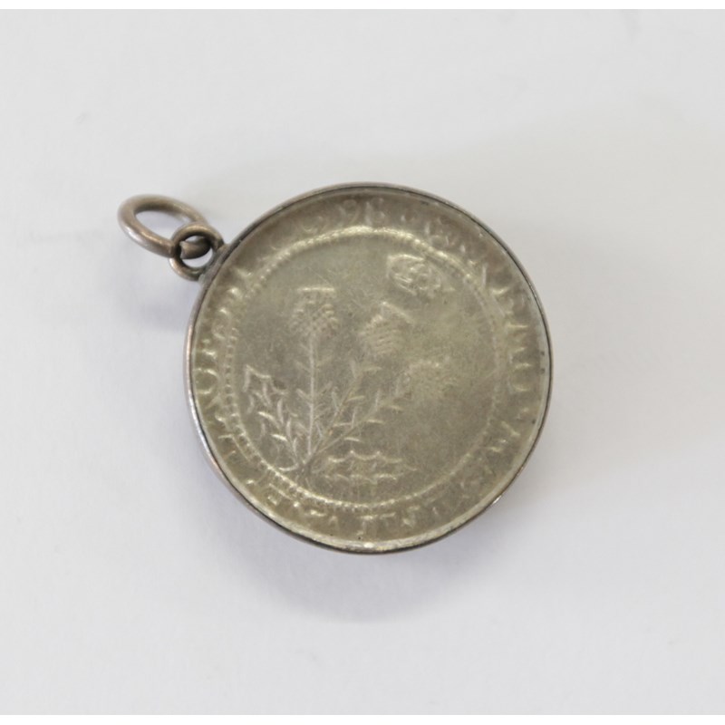 A James V1 of Scotland Ten Shilling piece, dated 1598 in a glazed silver coloured metal locket mount. With triple headed Thistle reverse, the case has chipped glass on one side.