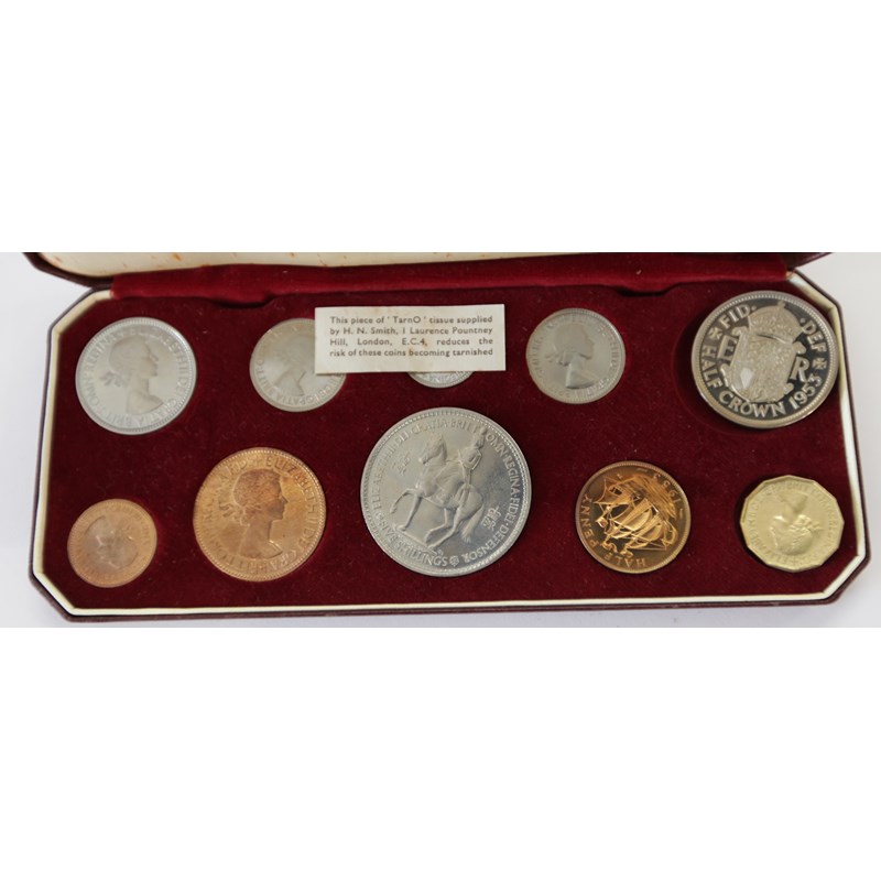 A cased crown to farthing 1953 set of ten coins, with original embossed lid. A Southern Rhodesia 1953 crown (Rhodes Centenary), again in box of issue. A Festival of Britain 1951 boxed crown, 1953 crown and polished William 111 crown with illegible date.