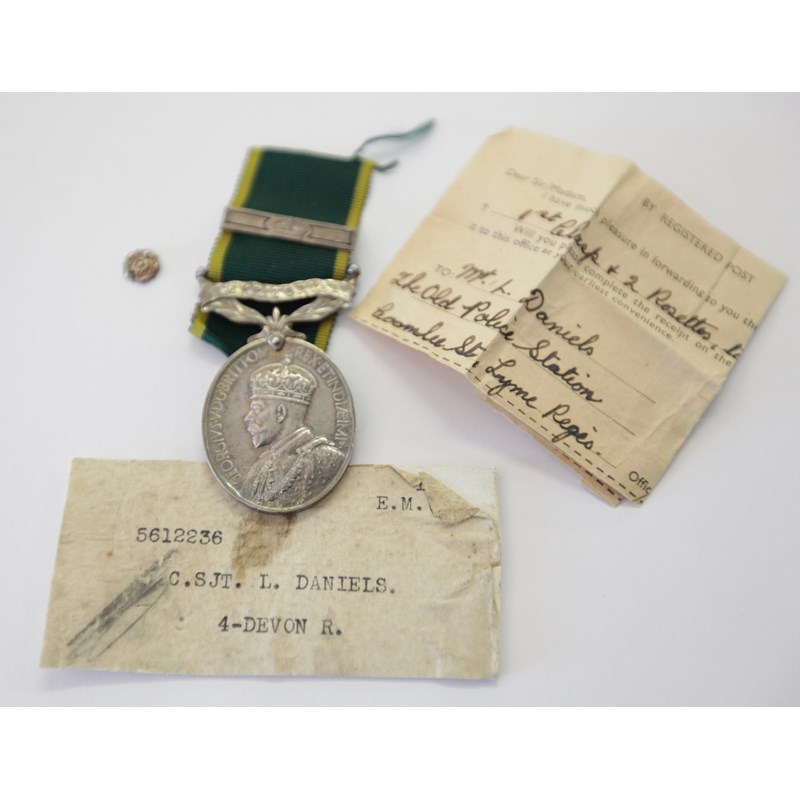 A George V Efficiency medal with bar Territorial and issue slip (1951). Named to 5612236 C. Sjt L Daniels 4th Devon Regt. The issue slip dated 1951 from the Infantry record Office. Exeter, is addressed to Mr L Daniels. The Old Police Station. Coombe Street. Lyme Regis. 1st Clasp and 2 Rosettes to E M (T). Note only one rosette is present, also a partial box lid of issue.