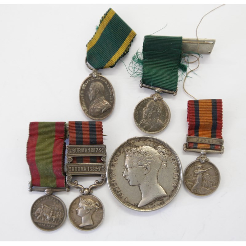 Including an Afghan War Medal 1878-80 no bar, also an IGS Medal 1854 with two bars Burma 1885-7 & Burma 1887-9. The two mounted for wear. A Queens South Africa Medal with single bar Natal, mounted for wear. An Edward V11 LSVF medal, on a two bar medal mount, also a George V TEM. All in silver with their original ribbons present. (5)