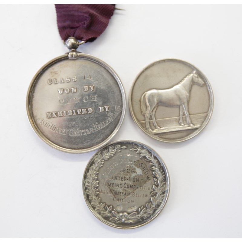 Two Irish Pony Show awards in Hallmarked Silver, 47mm diameter and weighing approximately 43 gms each. Each dated 1926 with Inter-Hunt Junior Competition, Miss H Grattan-Bellew on Chilion and Tatters respectively.