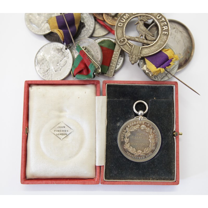 Including a scm medallion of 54 mm diameter, with top mount. Coll S Fr Xav Dub, DVC below obverse. With Ex Rhetor Victori reverse, 41 grms weight. Another with Meath Hospital and County Dublin Infimary award, in scm 1903 dated. Senior Clinical Medal awarded to William Boxwell, 38 gms. Two Dog Show medallions for Devon & Cornwall Pointer & Setter Society, 2nd Field Trials at Knighthayes, Tiverton, 17th Sept 1924. Won by Mjr P O'Kellys Irish setter, June. A hallmarked silver medal won by Billy Boy at Carlow 1922, 20 gms weight. A cased R Academy of Music scm award, to Alice D Barklie, Piano Forte 1926.