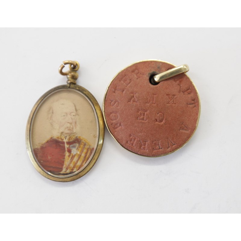 A 19thC faded miniature in a gilt locket mount, of an officer wearing a medal. (2)
