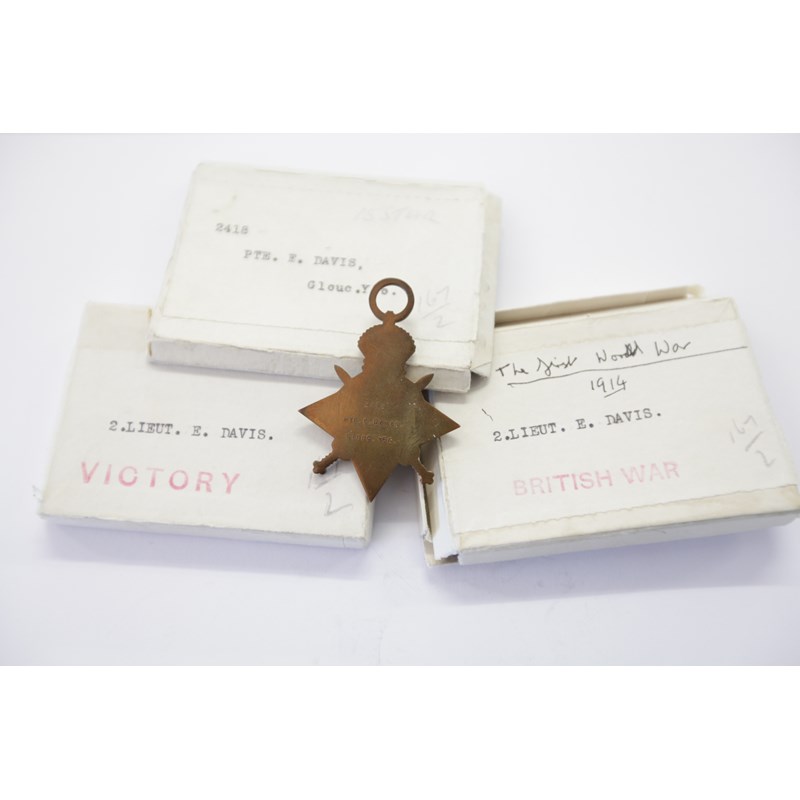 A mint 1914/15 Star lightly named (officially) to 2418 Pte E Davis Glouc Yeo. (issued in 1927). British War & Victory medals named to 2/Lt E Davis.
