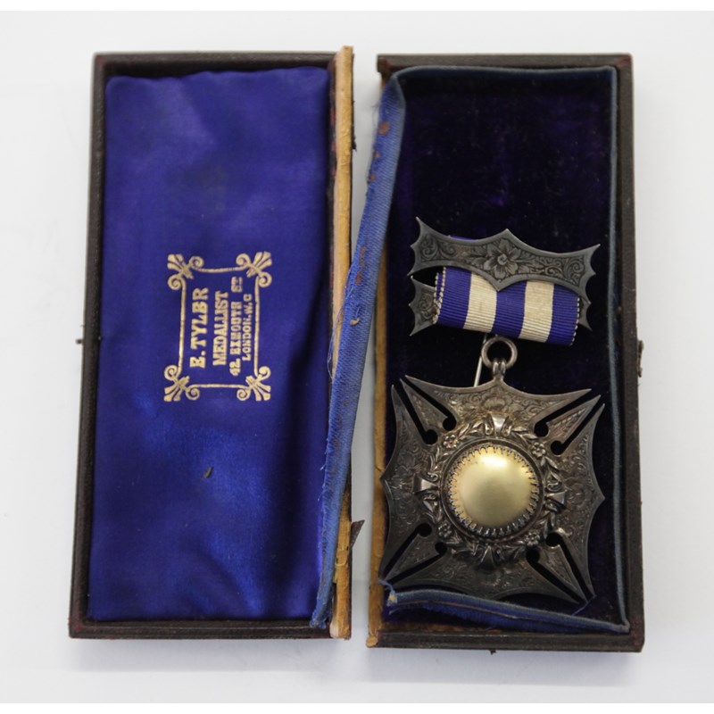 A LARGE CASED SILVER SPORTING AWARD 'ELMS CC'. A large silver sporting award in a damaged but repairable case, by E Tyler Medallist London. Silver top and bottom floral bars, on a blue and white striped ribbon. The ornate obverse of cross form, with inset spear heads. The reverse engraved Elms C C. 5 Miles Championship won by Sid Bennett 1892. A further silver award with S CA M R C R U C Div 1939. Lastly a bronzed Motorcycle award 25mm diameter, with engraved reverse. Taunton & District M C & L C Club, 100 Miles Reliability Trial 7th July 1921. (3)