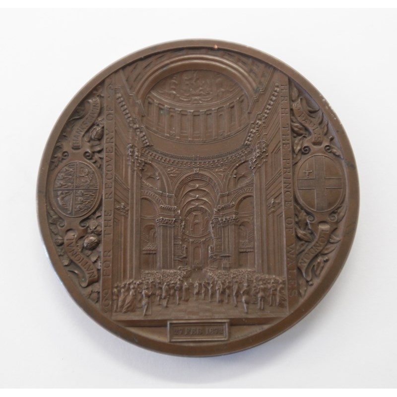 A bronze 77mm diameter medal, struck for the Recovery to Health of his H R H The Prince of Wales. St Pauls Cathedral and Royal Procession, also National Thanksgiving etc reverse. Number 1618 in British commemorative Medals, uncased