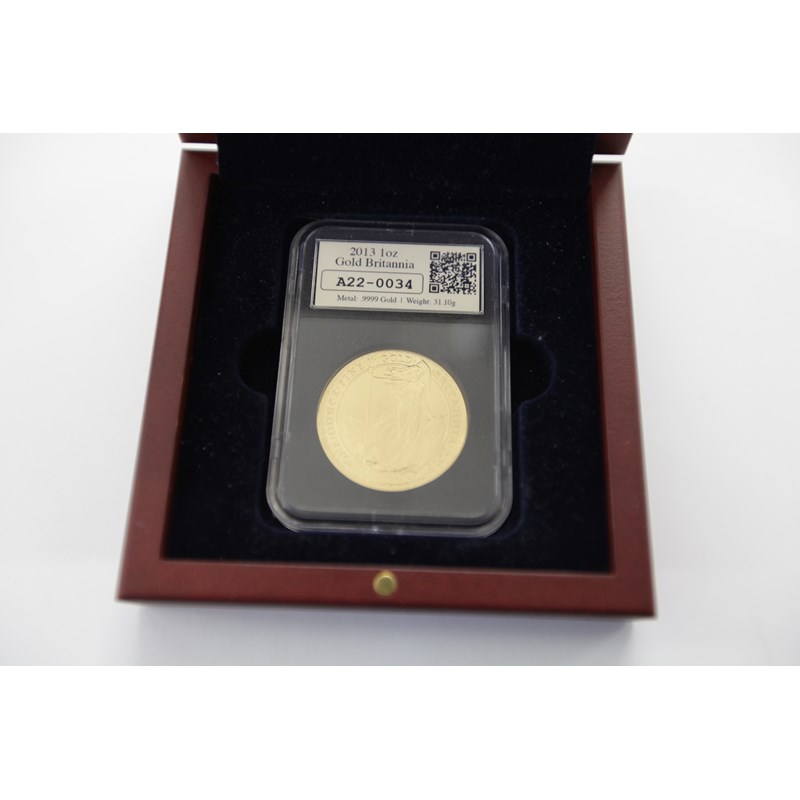 A £100 GOLD PIECE. A cased 2013 Britannia One Hundred Pounds Gold Piece, of 1 ounce weight. Contained in a sealed container numbered A22-0034.