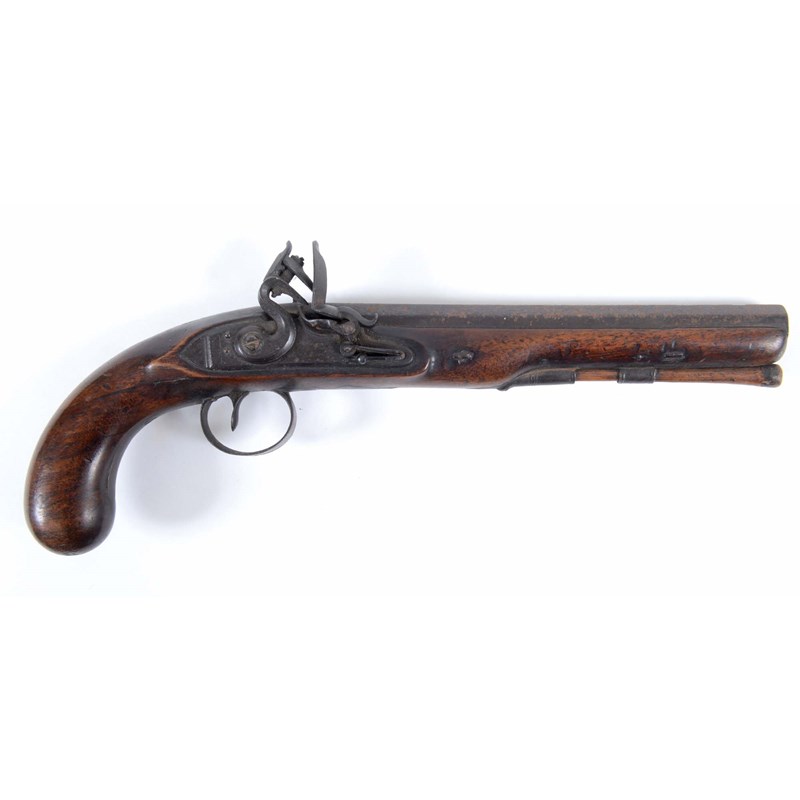 Both action with indistinct makers name, and mounts are of steel construction. Having an octagonal 8.7/8" barrel, with English Proof Marks and both sights present. Fullstock with underslung ramrod, roller frizzen and plain wood buttcap.