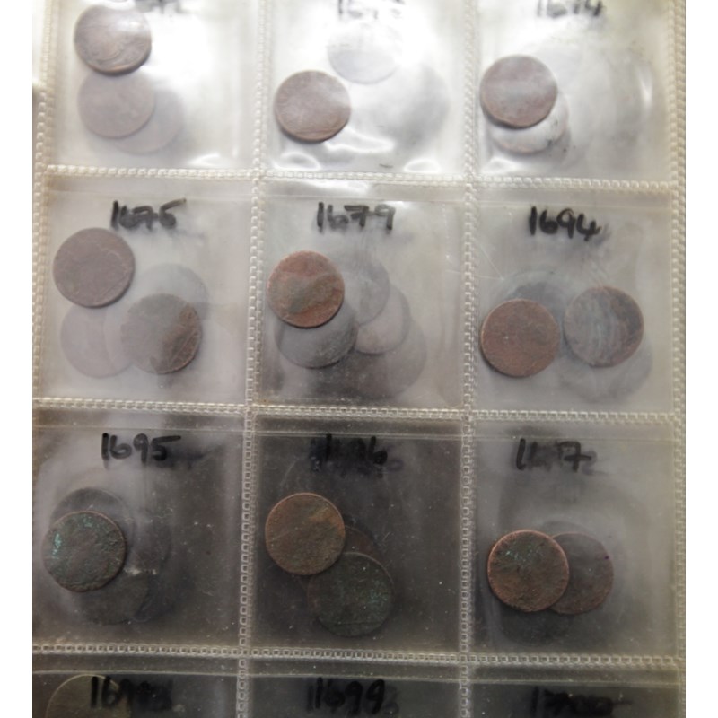 Including farthings of Charles 11, dated 1672-73-74-75 and 1679. William 111 , George 1-11 and 111 also William 1V 1836 examples. Halfpennies of William et Maria 1694, William 111 dated 1695-96-97-98-99-1700 and 1701. George 1 examples dated 1717-18-19 and 1720. Further George 11 and George 111 examples are in the album. Most coins are in a worn condition.
