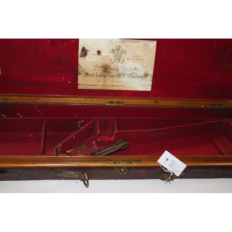 The first for a double 30" barrelled shotgun, with makers label inset. Stephen Grant of 67 St James Street, gun-maker to HRH The Prince of Wales. Also a label suggesting charges for breech loading guns. Lacking two of its three straps, the other two in poor condition.