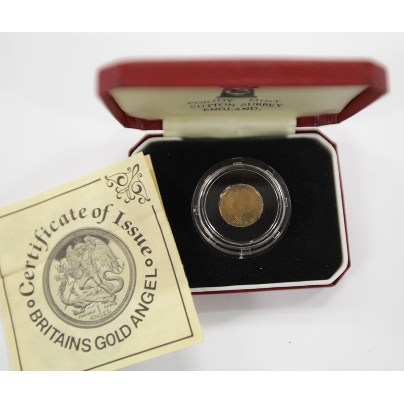 A 1/10th GOLD NOBLE PIECE. An I O Man 1/10th ounce gold Noble, complete with associated certificate of issue.
