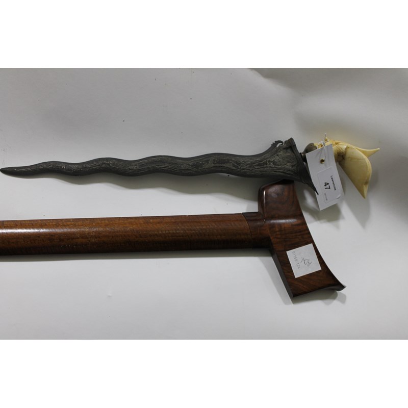 A Kris with carved white horn Garuda bird hilt, having a wavy edge water pattern blade of 13" in length. Complete with its original wooden scabbard, with carved throat.