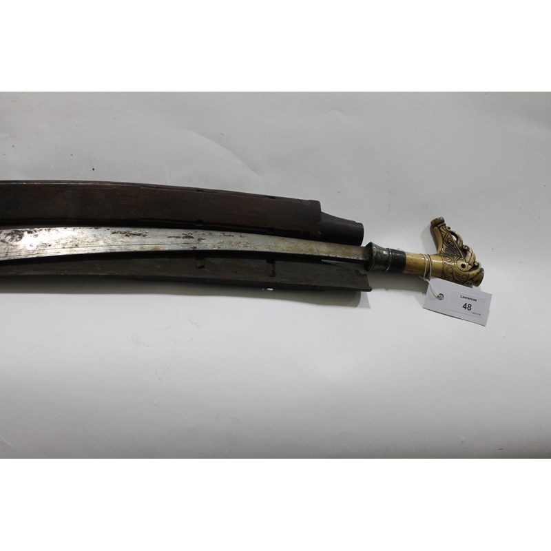 A DYAK SWORD. A Dyaks sword with carved horn hilt, having provision to display enemies hair. Curved single-edged blade of 22" length, the wooden scabbard of two piece construction lacking the ties.