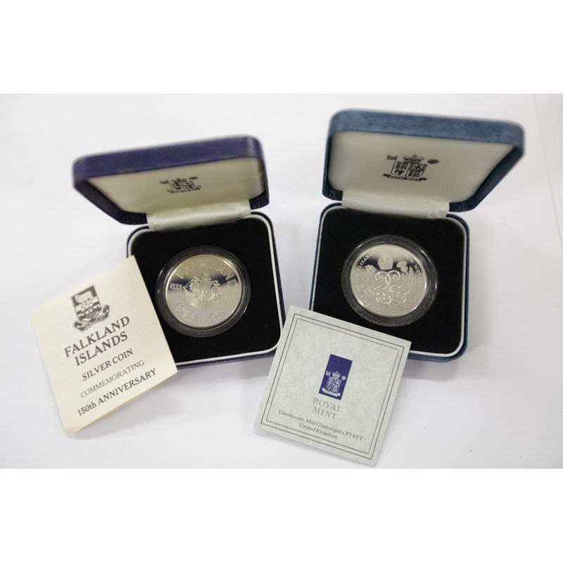 5 piece, complete with its certificate of issue. A Solomon Islands 1991 50th Anniversary 1991 piece, complete with its certificate of issue. A N H S 1998 50p piece complete with certificate, A 1997 50p piece again with its certificate. A 1990 2 coin set (5p), a 1990 (£5) Crown another of 1993 (£5) all with certificates present. A Falkland Islands 5p piece 1983, a UK 1992 10p x 2 set, a Falkland Islands £1 piece. All with certificates of issue present. (10)