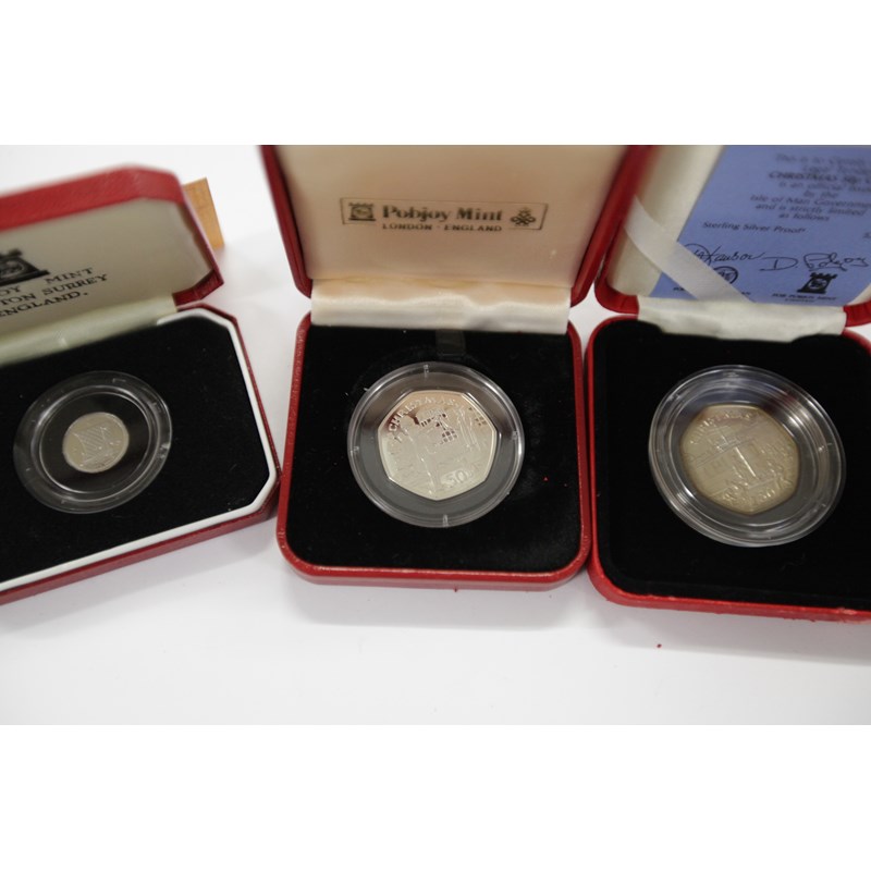 Including a 1981 Royal wedding Crown, a 1995 dated £2 piece. A Seychelles 20 Rupees dated 1983. Isle of Man Xmas issue 50p pieces, dated 1987-1988 also 1989 and 1992. A 1980 dated I O Man 50p piece, a 1/10th Troy ounce Platinum piece, etc. All with certificates of issue being present. (14)