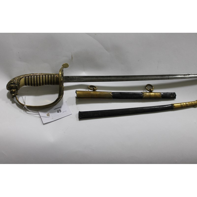An Imperial German period naval officers sword, complete with its scabbard. (in two pieces). The slim 25.5/8" blade is marked with the two squirrels trade mark of Carl Eickhorn. The hilt with lions head pommel, red and green eyes and double folding guard. Crown above anchor and gilt plated, hilt and fittings. Gilt mounts on the scabbard, usual break due to leather shrinkage.