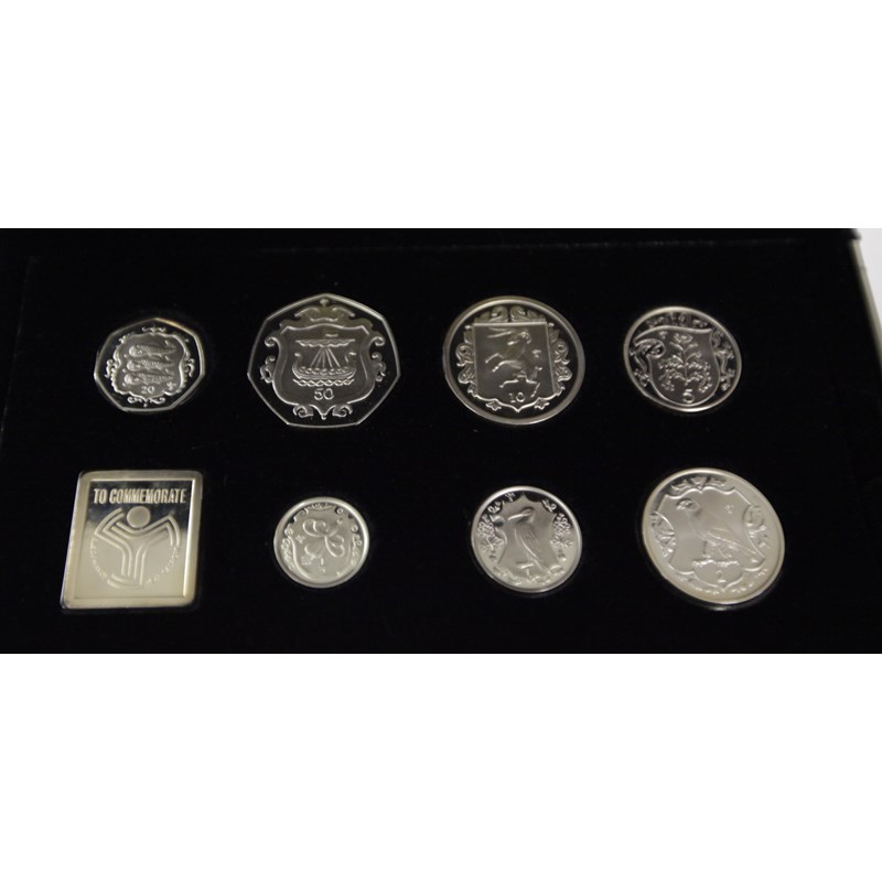 Including the 1981 Royal Wedding Silver Proof Set (4), with its issue slip present. An I O Man Silver Proof Set 1980 (7) , with issue slip present. Cased I O Man 1984 dated £5-£1-50p-20p-10p-5p-2-1p and 1/2p (7), with issue slip. I O Man 1985 dated £5-£1-50p-20p-10p-5p-2p-1p-1/2p set (9). Silver clad 1984 Olympics Set.