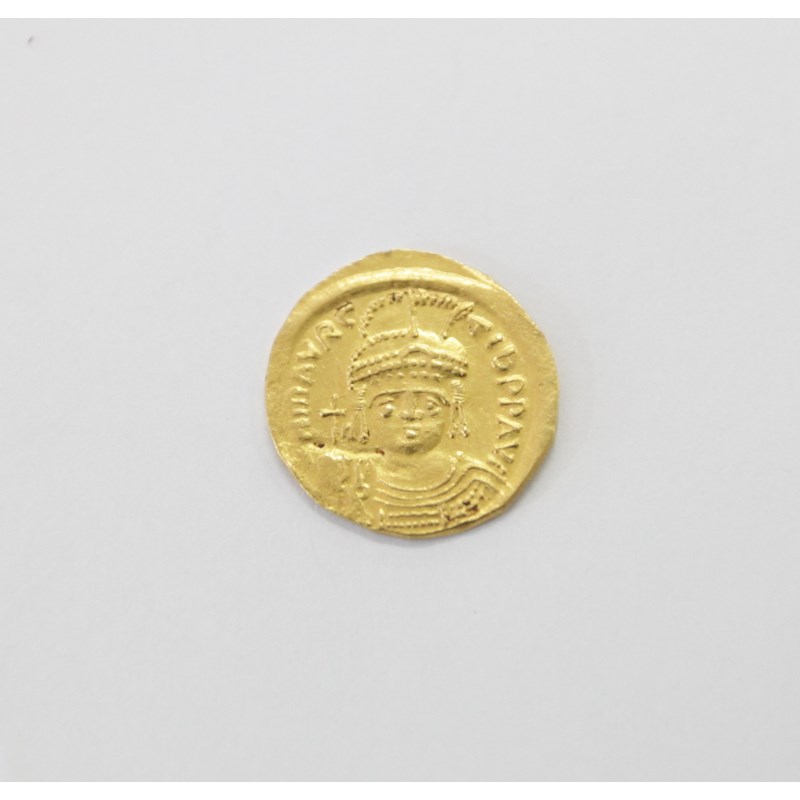 A gold Solidus of the Emperor Maurice Tiberius, Byzantine Emperor 582-682 AD. Front facing bust holding a shield in his left hand, globus in right hand with DN MAVRITb PPAV1 legend. Reverse with Victor AAVCB and Conob legends. 4.4 gms.
