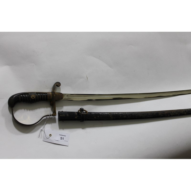 A doves-head sabre with gilt finish to the guard and hilt, having plain langets. The gilt wire wrapped grip is lacking its leather finger strap, part of which remains in the hilt. Chromed 32" blade with makers mark, Squirrel and sword-Carl Eickhorn. Having a steel scabbard, with single wear loop.