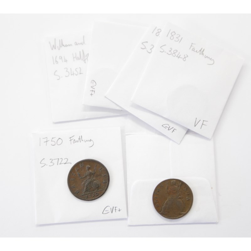 GB COPPER COINAGE. Including a William et Maria 1/2d dated 1694. A Charles 11 farthing dated 1675. Farthings of 1831-1835 and 1866 etc