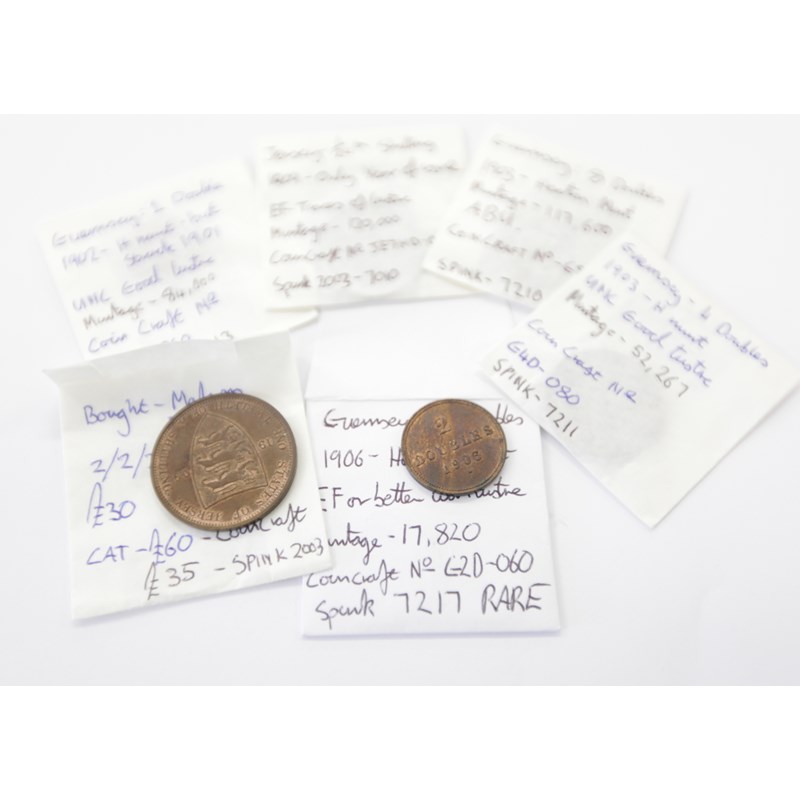 CHANNEL ISLANDS COINAGE. Including a Guernsey 4 doubles 1903 'H' mint, a 1903 dated 8 doubles again 'H'mint. Double of 1902 of the same mint, 2 doubles of 1906. A Jersey 1/24th shilling 1809 and a 1/12th shilling 1906. (6)