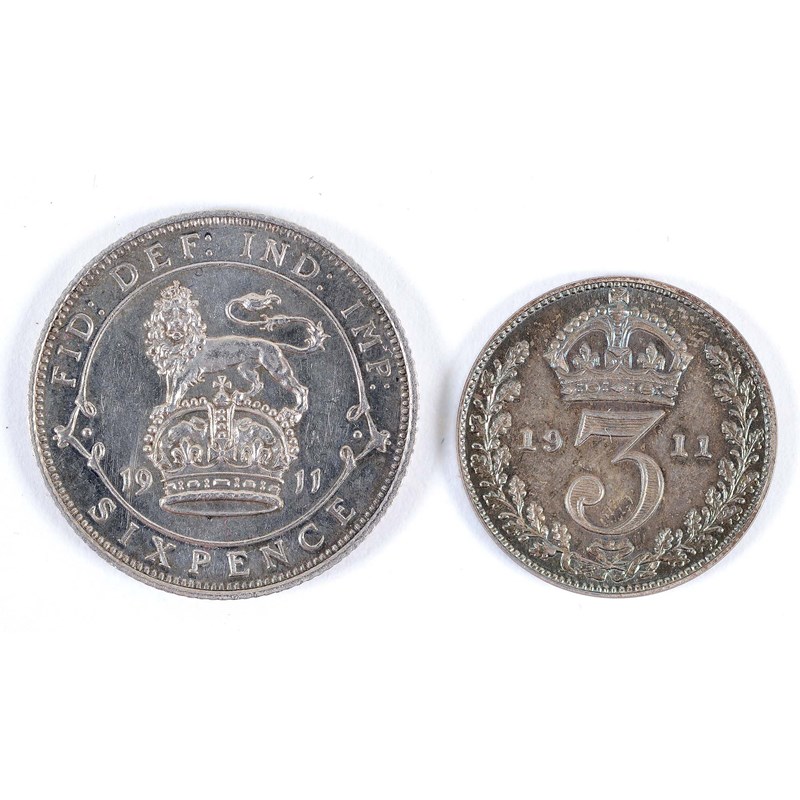 GV PROOF COINAGE. Two silver proof coins of George V, a sixpence and a threepence piece both minted in 1911.