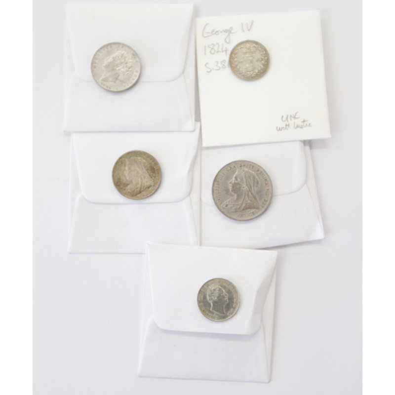 SILVER COINAGE. Including a George 1V threepence piece dated 1824, also a sixpence of 1826. A William 1V groat dated 1836, a Victorian shilling dated 1893 together with a sixpence piece dated 1900.(5)