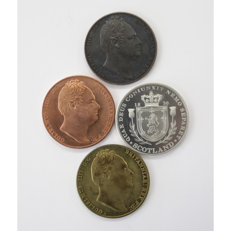 UNC pieces dated 1830 of William 1V, in Scotland. 40mm diameter in white metal x (4). In copper, brass and bronzed finishes (3).
