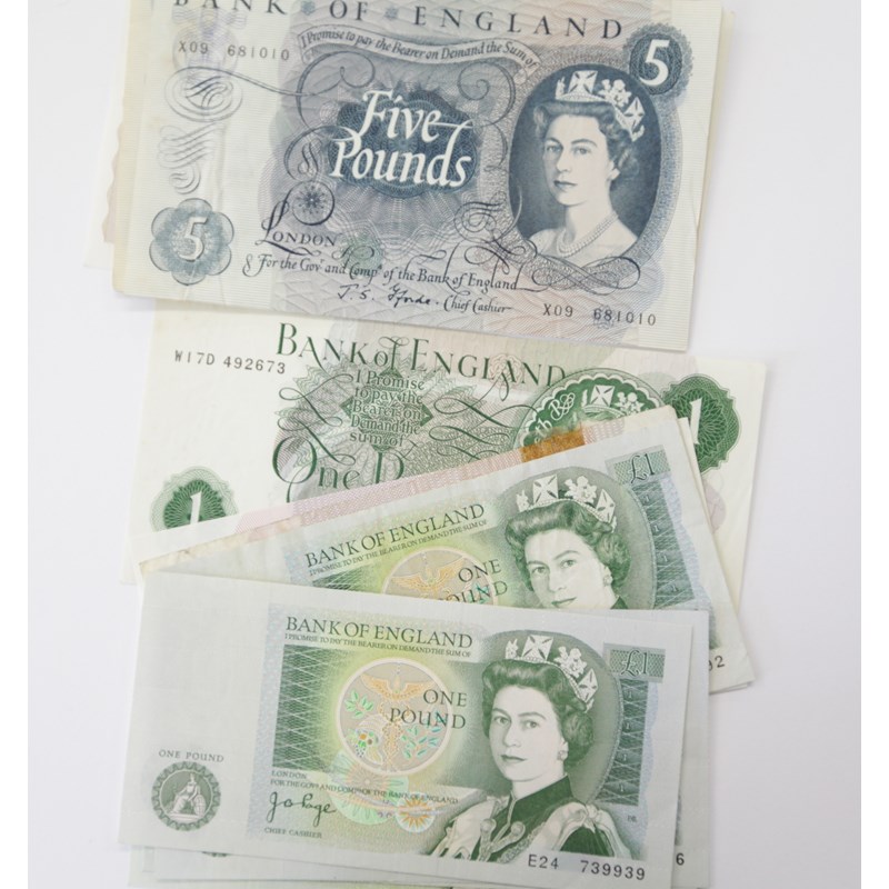 Including a Somerset £10 note, 56A 102721. Three £5 notes signed Fforde (2) and Hallam. X09 681010-T81 115570 & B59 577562, respectively. Three Page and four Somerset One Pound notes. Fforde 10/- notes x 2 (13 in total).