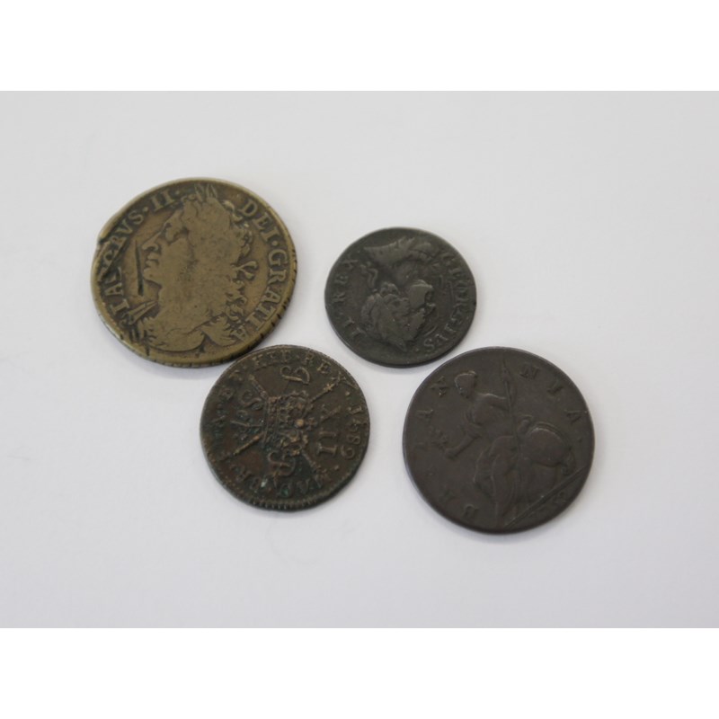 IRISH GUN MONEY. A Gun Money Halfcrown XXX Nov 1689 reverse, a Shilling of September 1689. A George 11 1754 farthing, also a Halfpenny of 1752. (4).