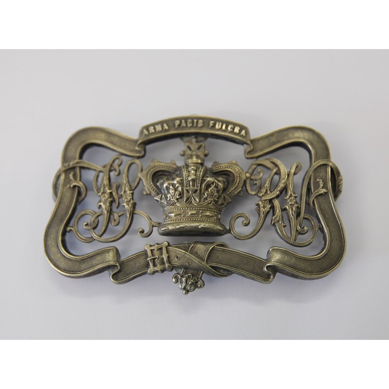 Including a Victorian officers Pouch Badge, with the motto Arma Pacis Fulcra above a central crown. The stylised lettering ends with RV, the first two need identification. J S ? R V. All within a belt outer.