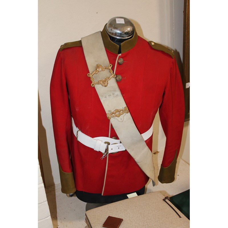 A other ranks red tunic with kahki cuffs and collar. White crossbelt and waistbelt with General service clasp. N Fusiliers shoulder titles and buttons, in good condition on a tailored stand.