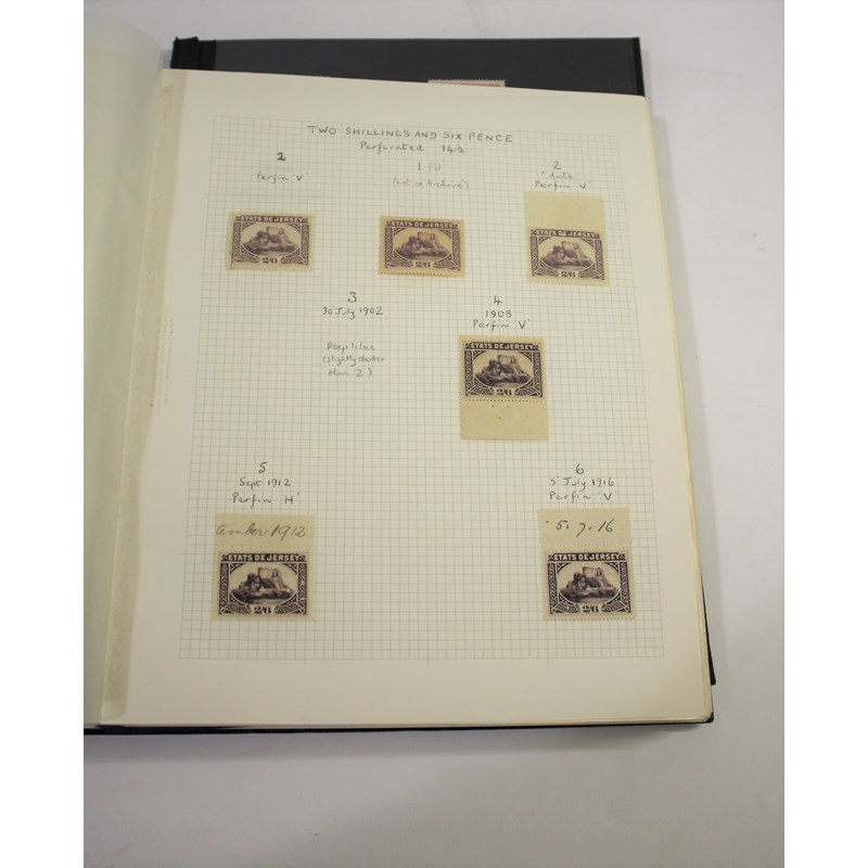 including an album with Jersey Revenues 1900-1970, specialised study with mint blocks, used on piece specimen values up to £100. Also with an album of deeds and documents, most with Jersey Revenue Stamps. (2)