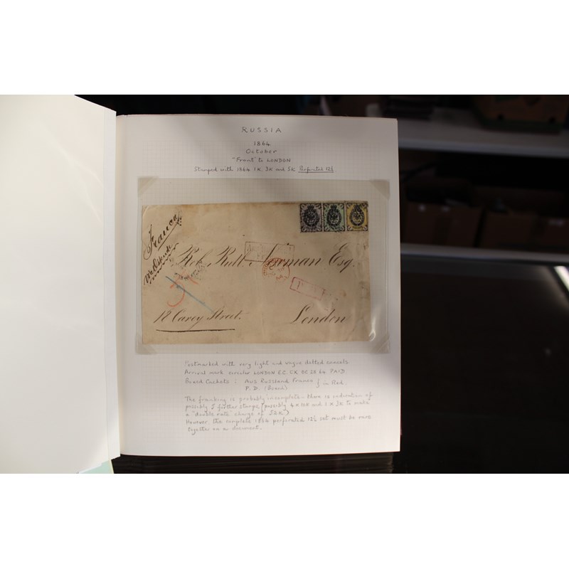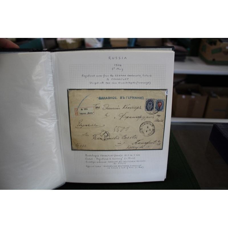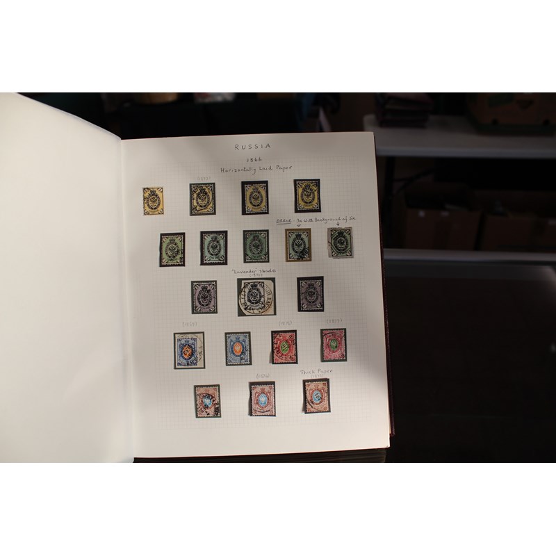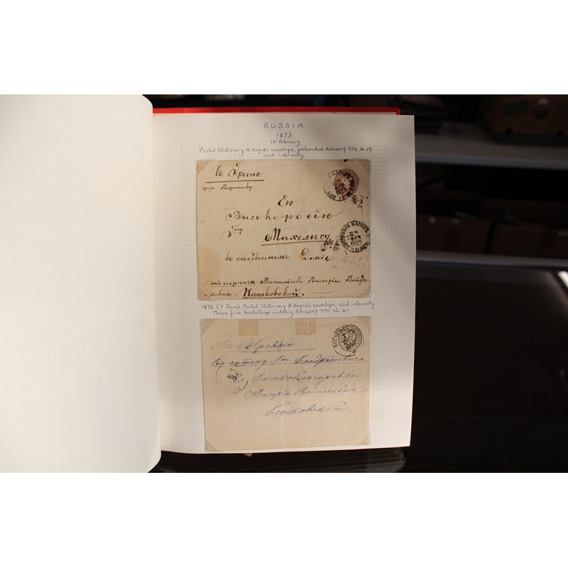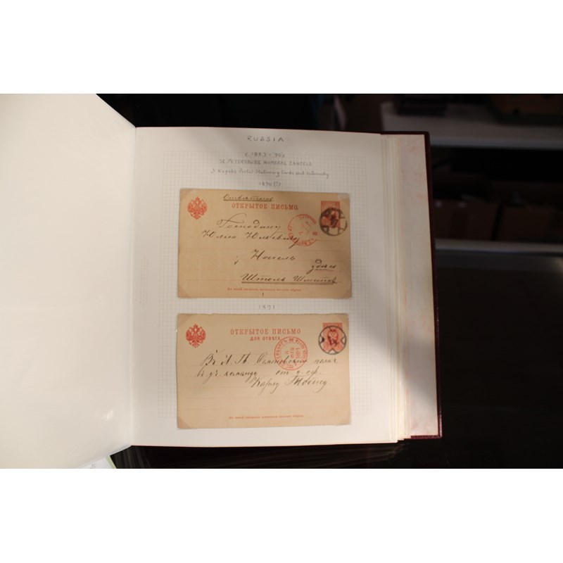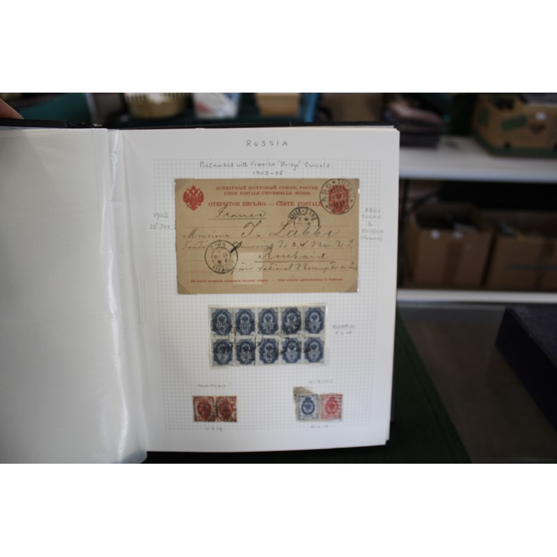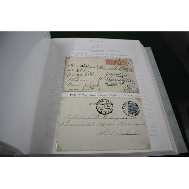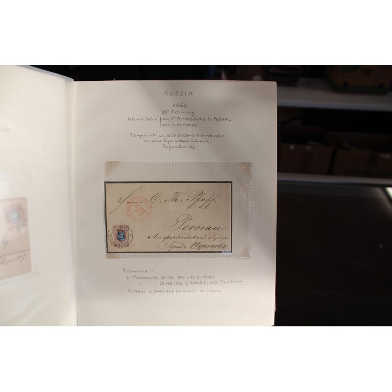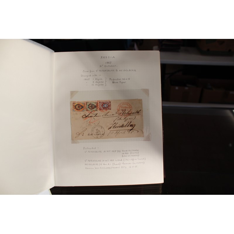 a fine collection of Russian stamps in 4 albums, from 1858 10k imperf used, 1866 3k error background used, 1884 3r50 and 7r used, much postal history with Arms Issues on cover, Postmarks, Post Offices in Levant and China, and Postal stationary used. Also with a qty of loose covers. Items in albums with various written information.