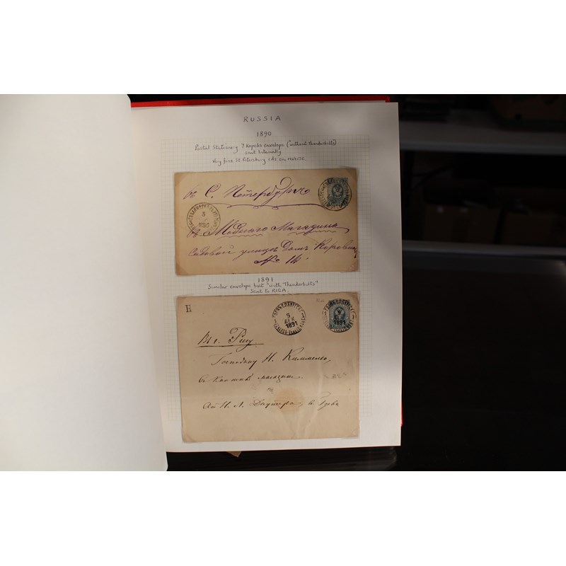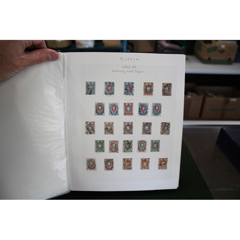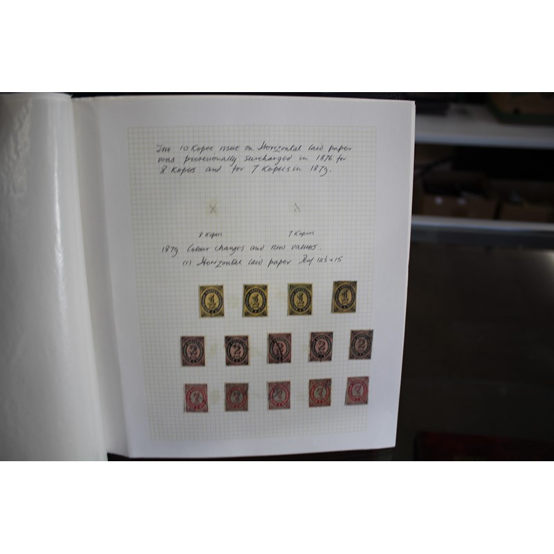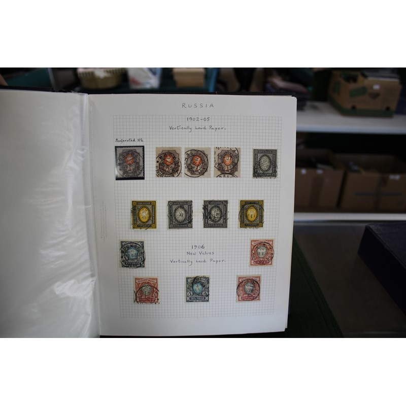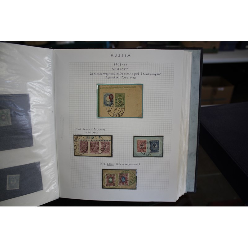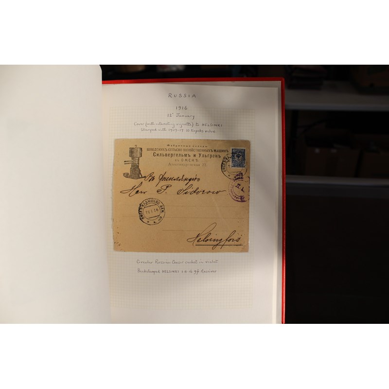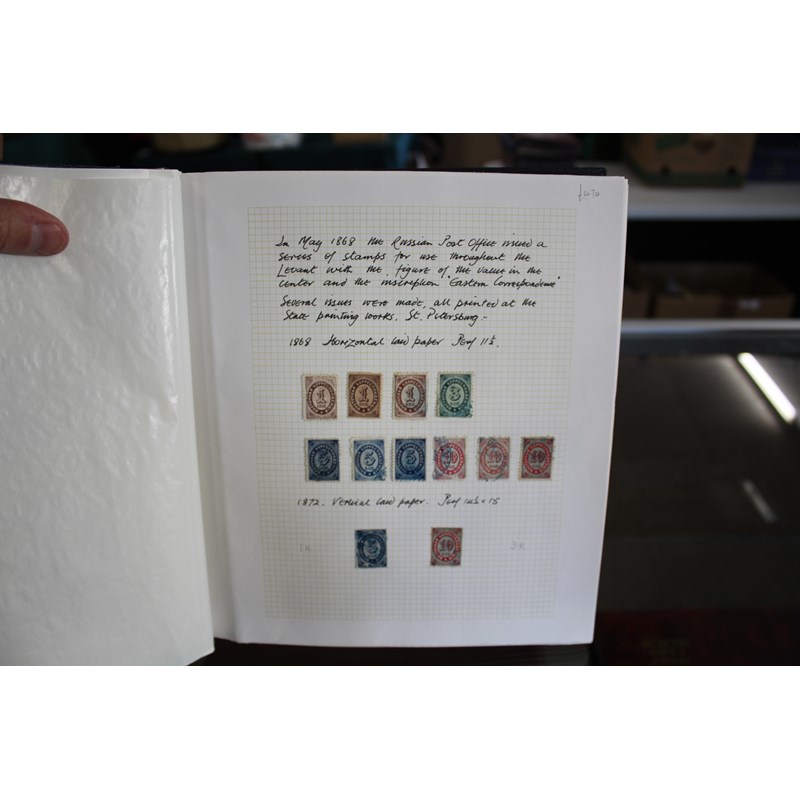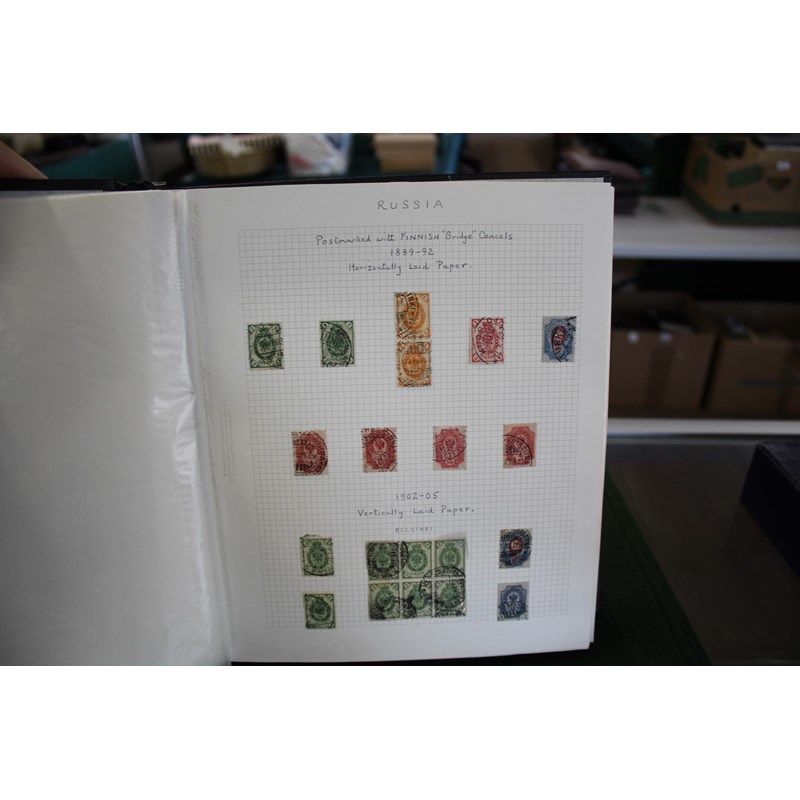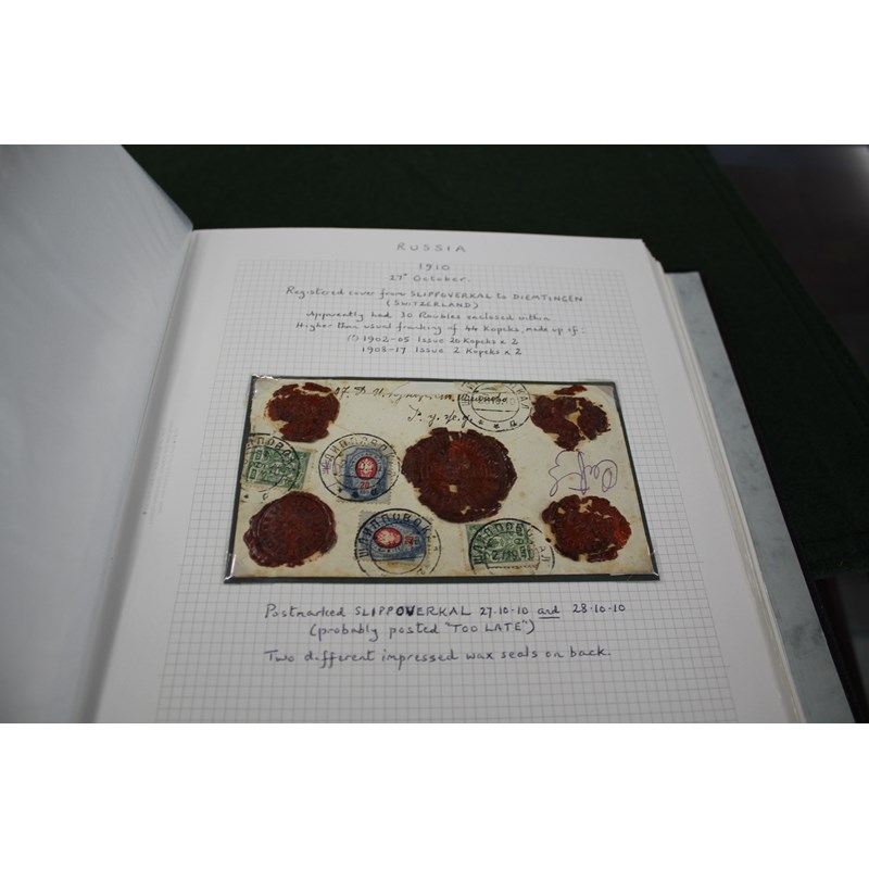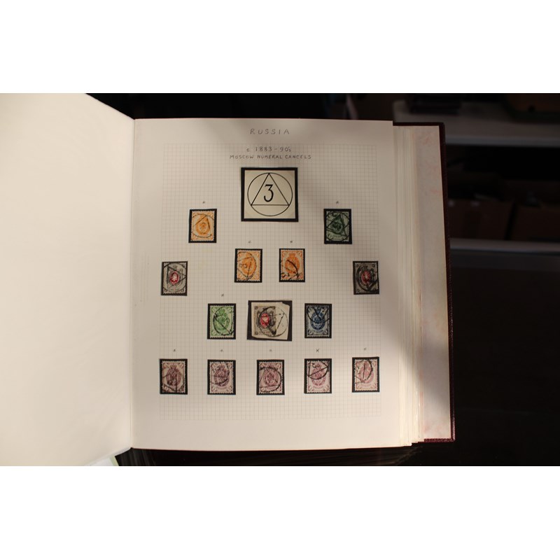 a fine collection of Russian stamps in 4 albums, from 1858 10k imperf used, 1866 3k error background used, 1884 3r50 and 7r used, much postal history with Arms Issues on cover, Postmarks, Post Offices in Levant and China, and Postal stationary used. Also with a qty of loose covers. Items in albums with various written information.
