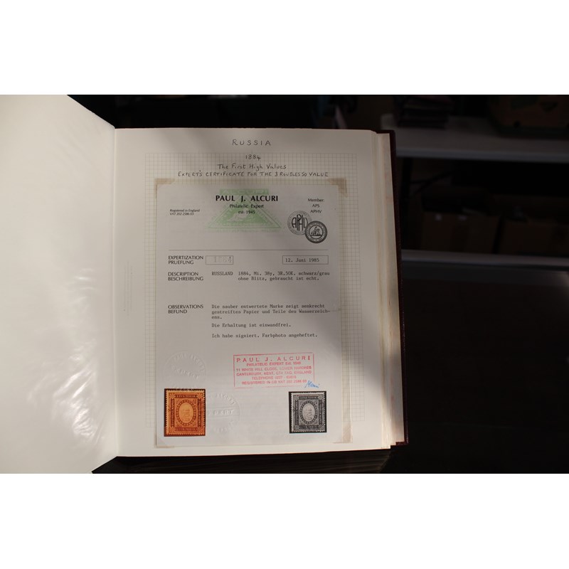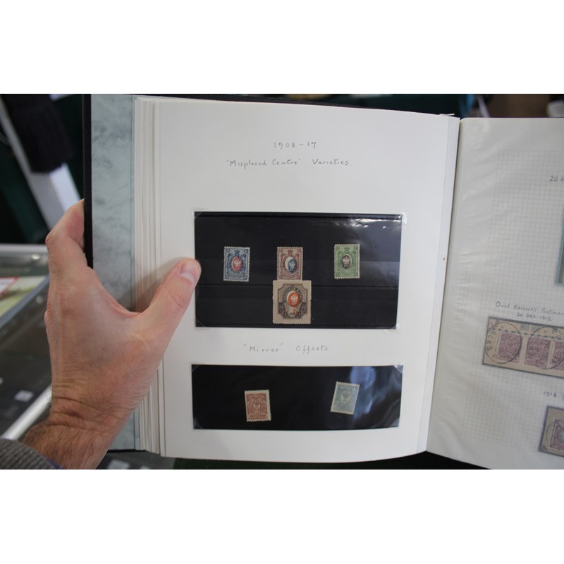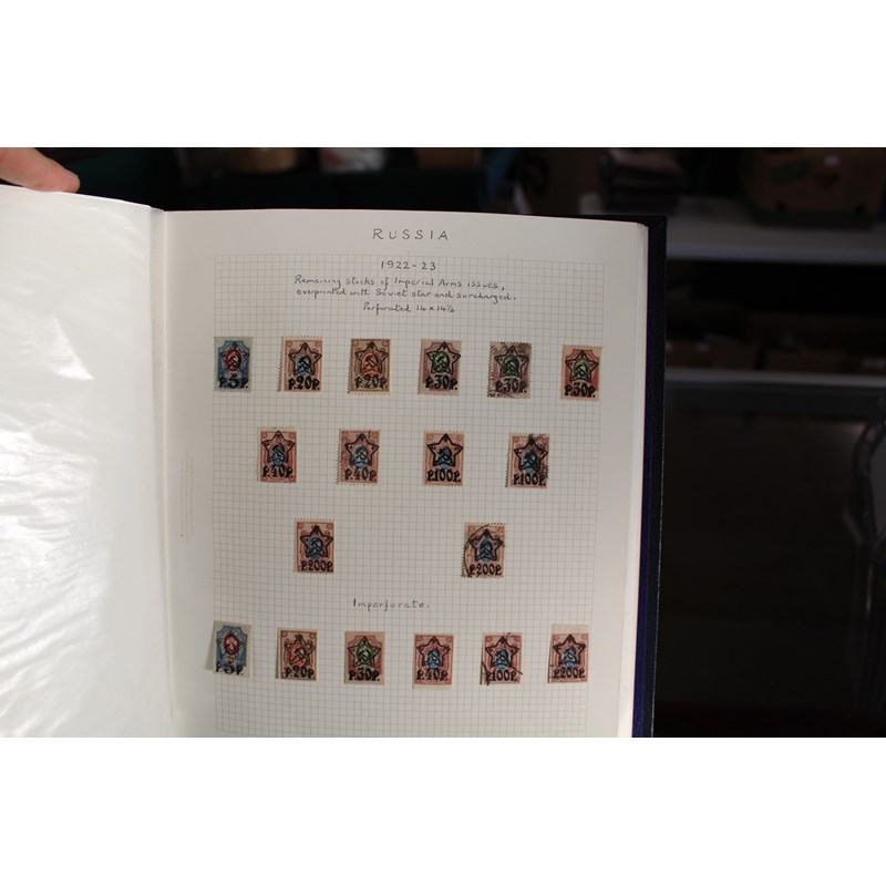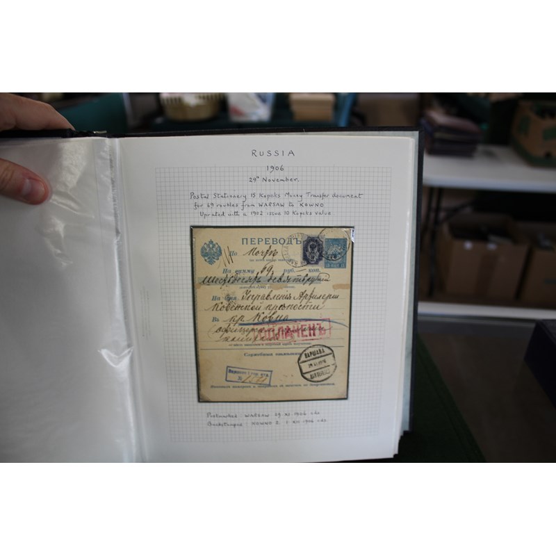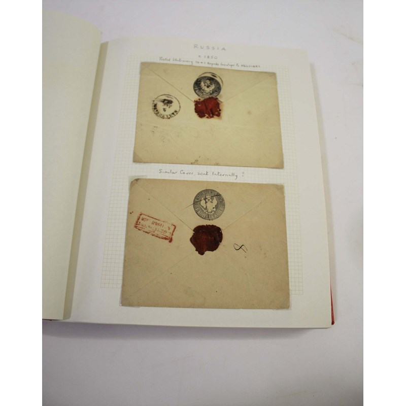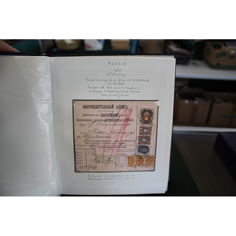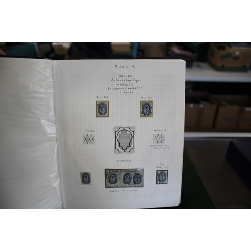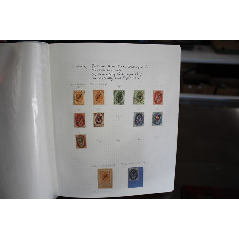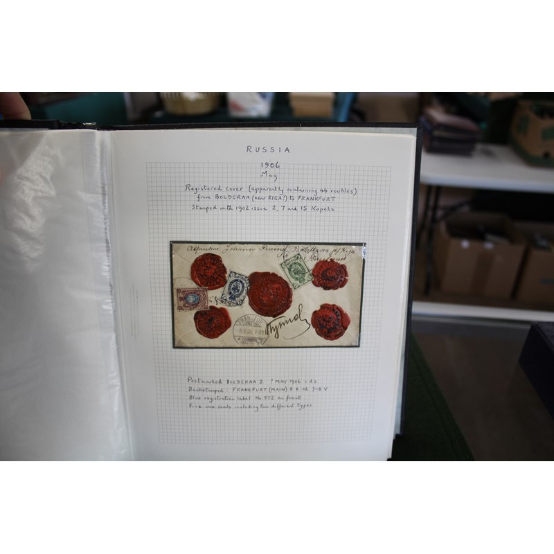 a fine collection of Russian stamps in 4 albums, from 1858 10k imperf used, 1866 3k error background used, 1884 3r50 and 7r used, much postal history with Arms Issues on cover, Postmarks, Post Offices in Levant and China, and Postal stationary used. Also with a qty of loose covers. Items in albums with various written information.