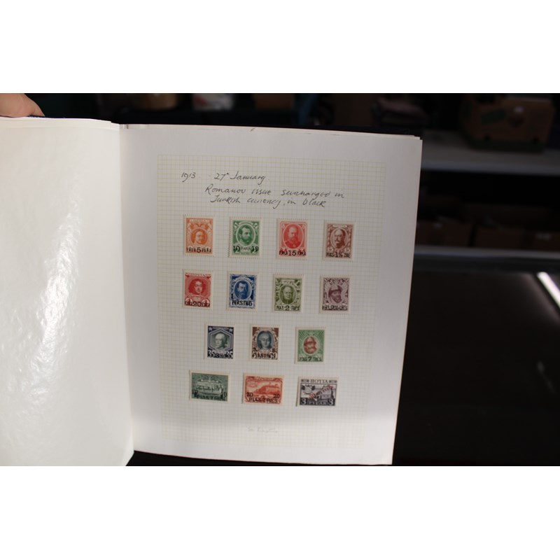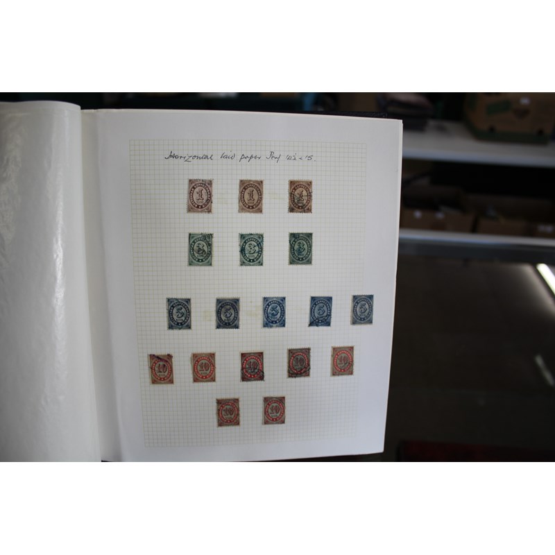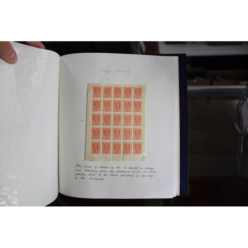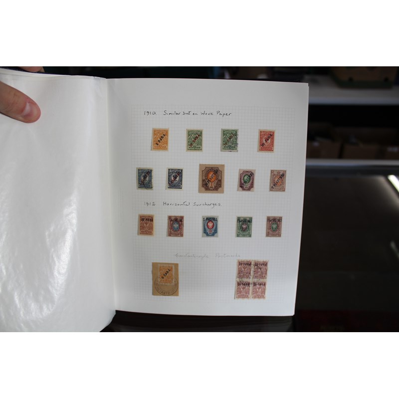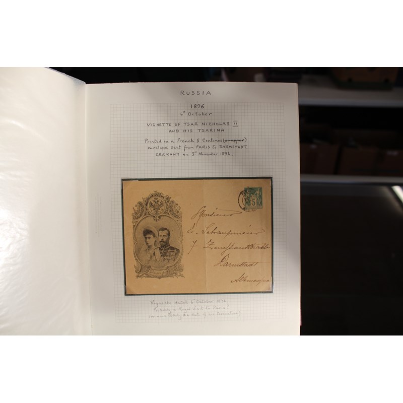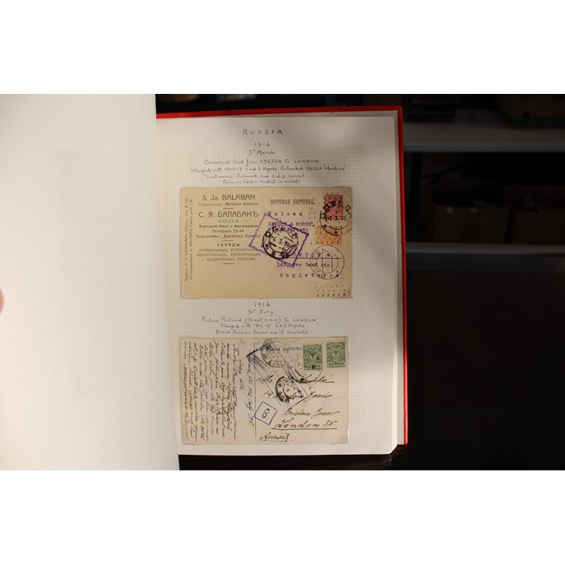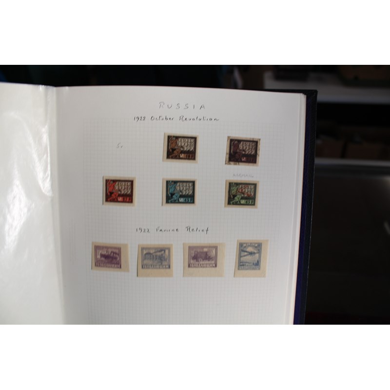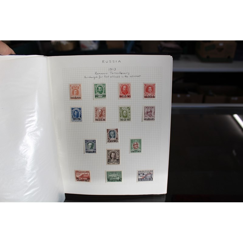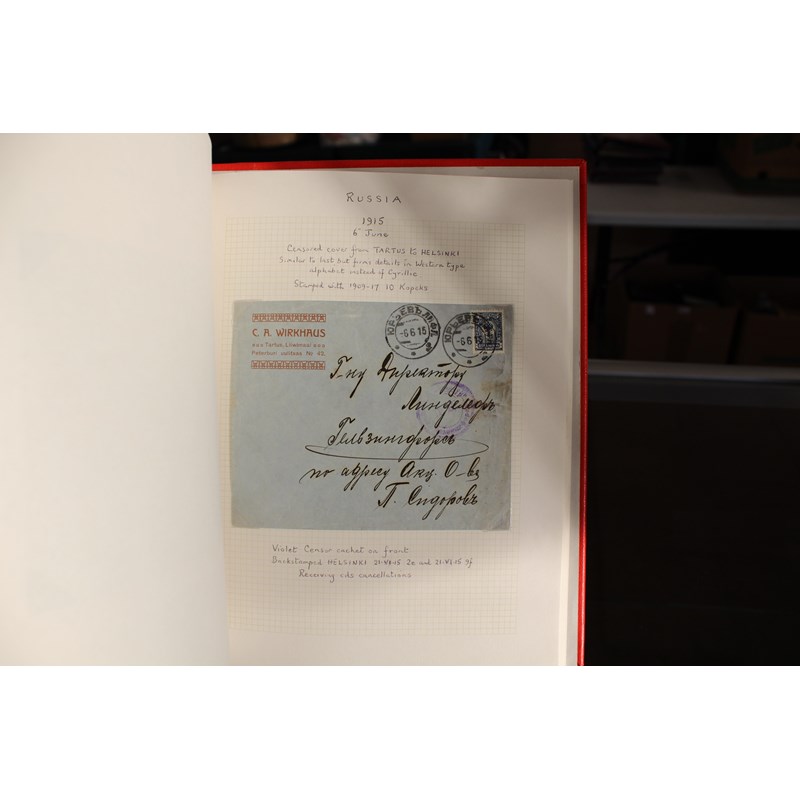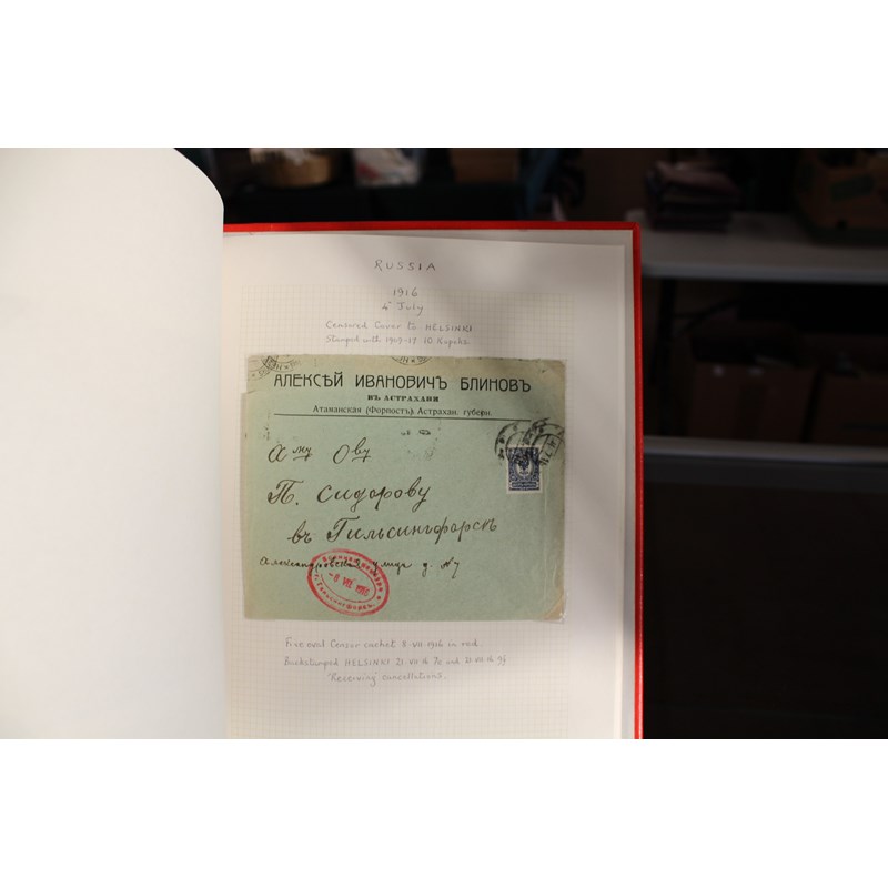 a fine collection of Russian stamps in 4 albums, from 1858 10k imperf used, 1866 3k error background used, 1884 3r50 and 7r used, much postal history with Arms Issues on cover, Postmarks, Post Offices in Levant and China, and Postal stationary used. Also with a qty of loose covers. Items in albums with various written information.