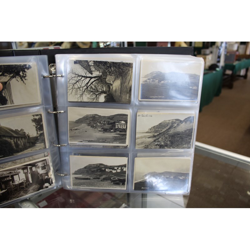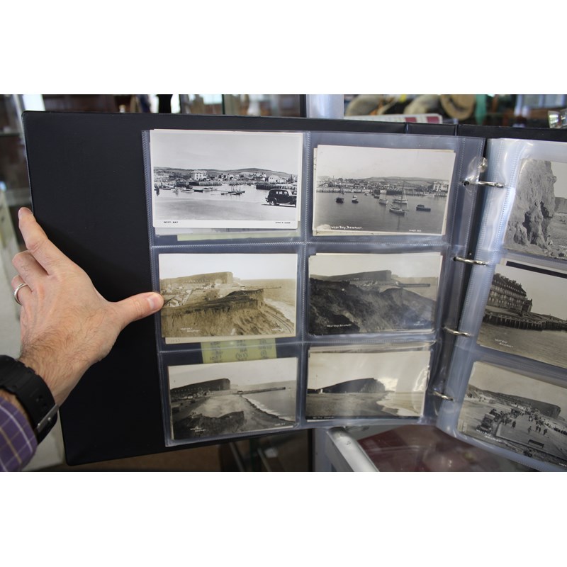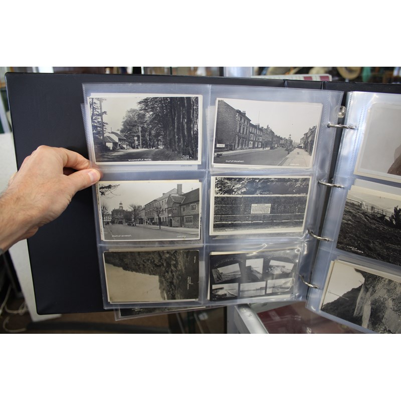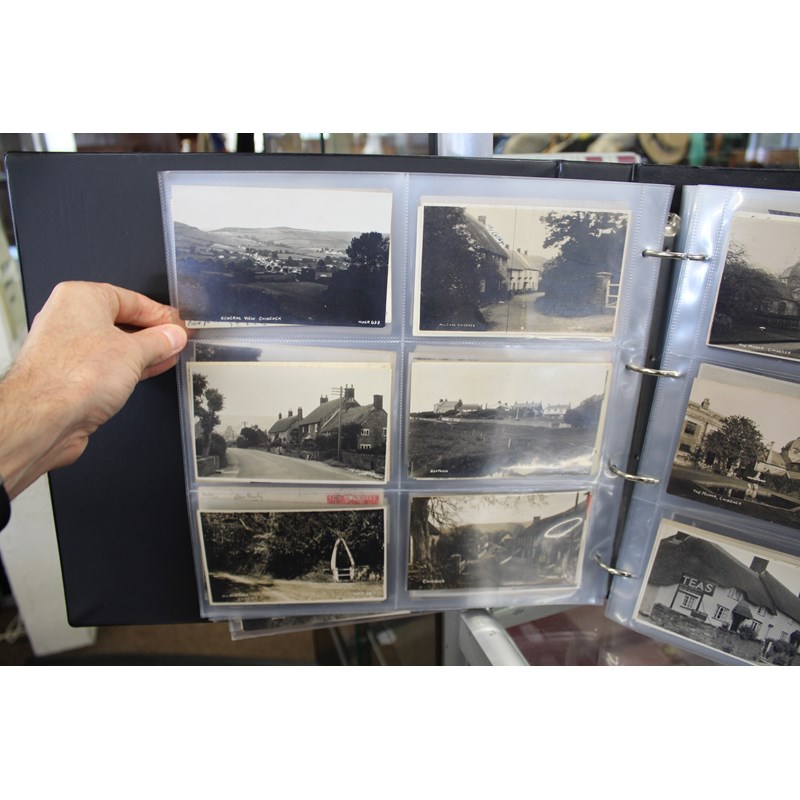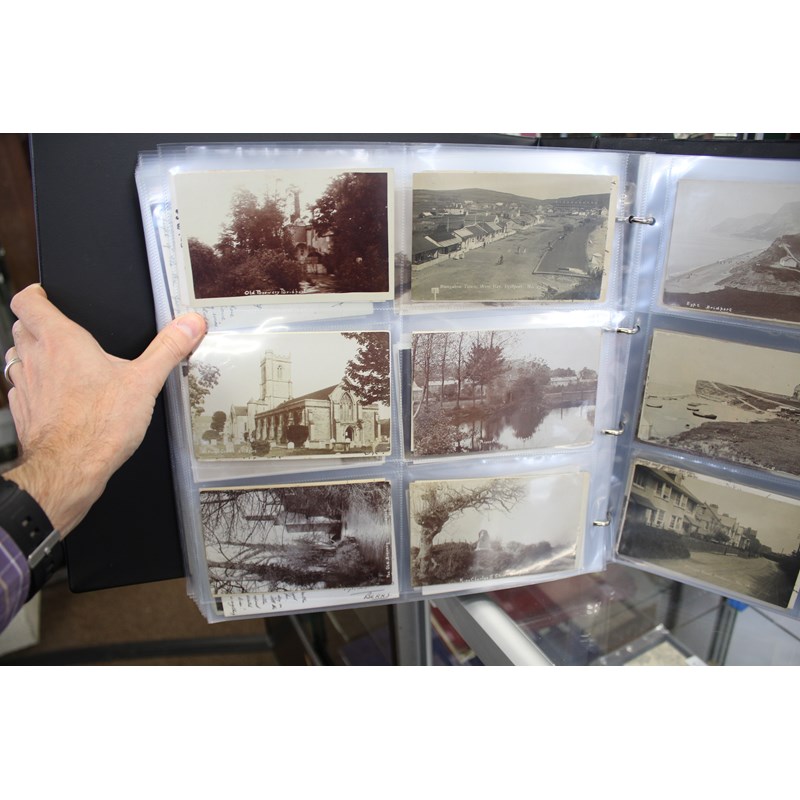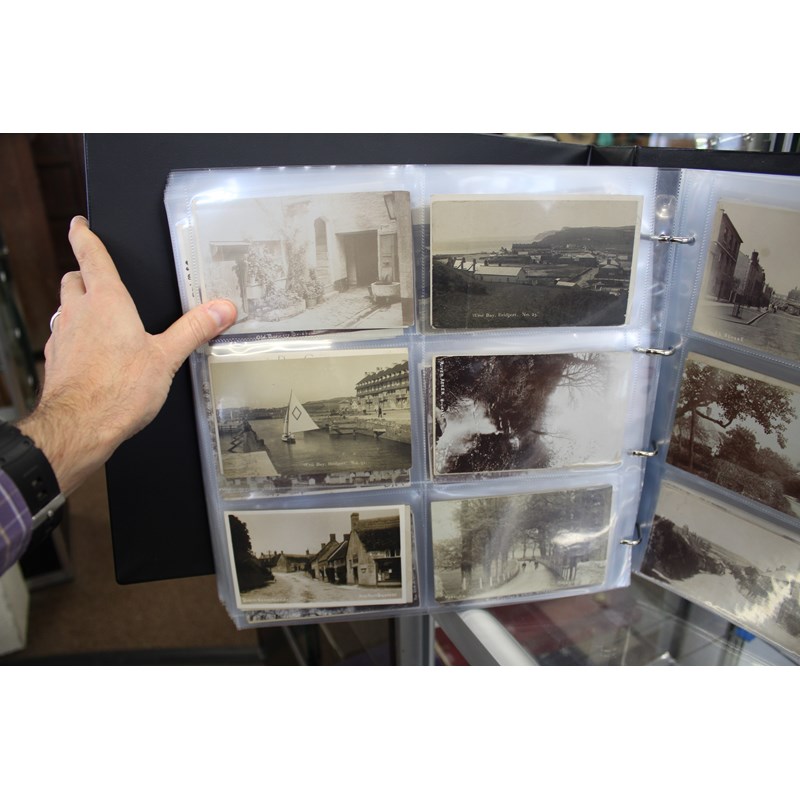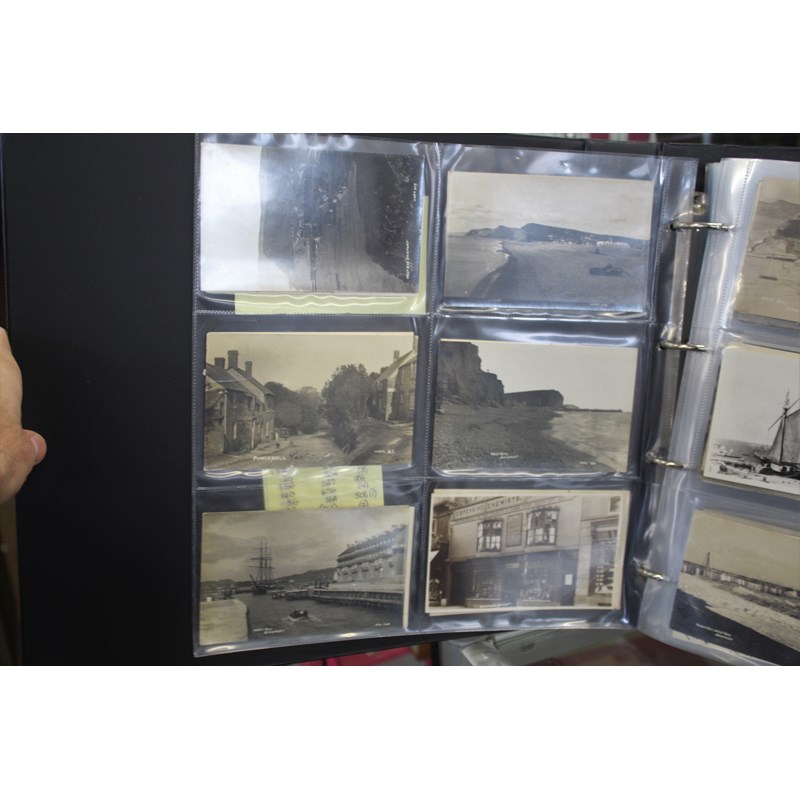a large album of approx 500 local postcards, including West Bay (various), Bradpole, Netherbury, Bridport (various), Shipton Gorge, Charmouth (various including Coronation decorations 1911), Puncknoll, Walditch, Stoke Abbott, Powerstock, Chideock (various), Seatown, Burton Bradstock (various), Beaminster, Toller, Eype (including SS Victoria passing Eype), Monkton Wyld, Swyre, Loders, Bothenhampton, Broadwindsor, Symondsbury, and many more. Also with some local photograph postcards (various groups, children etc), many postcards by Claud Hider, Bridport.