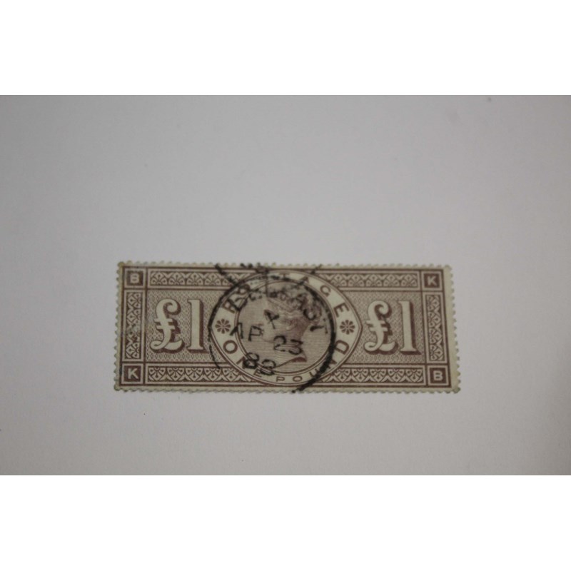 £1 BROWN LILAC STAMP a 1888 £1 brown lilac watermark orbs, used with Belfast cds (SG186), small corner crease.
