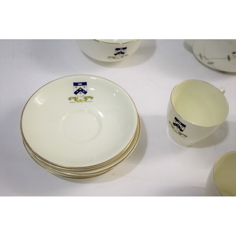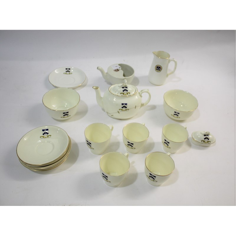 a part Royal Doulton tea set with the crest of Ormond College, including a teapot (damaged), 5 saucers, 5 cups, and 2 sugar bowls. With other items with the college crest including items by Tuscan China.