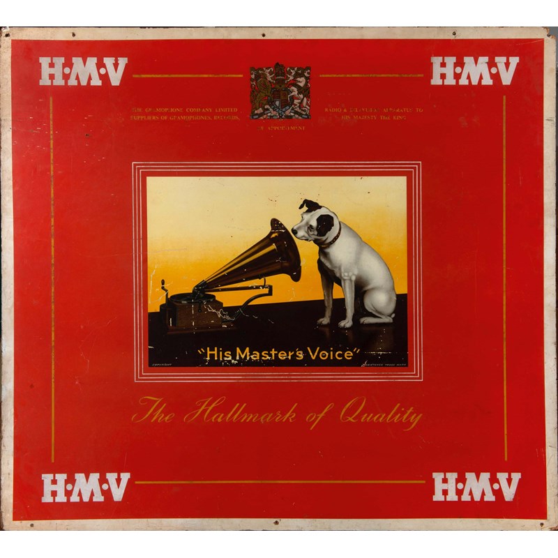 LARGE HMV ADVERTISING SIGN a large advertising board for HMV The Hallmark of Quality, 122cms by 112cms