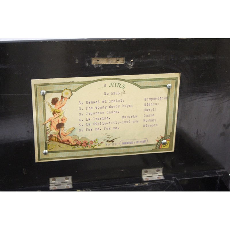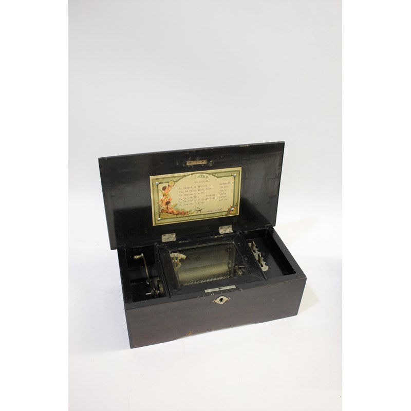 a late 19thc musical box, with a 6 air movement and change/repeat and start/stop levers. In a rosewood effect case. With a songsheet on the inside of the lid, marked No 8353, Manufactured in Switzerland. In working order and teeth are present. Cylinder 9cms long, Case 32cms across