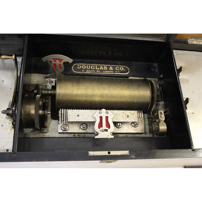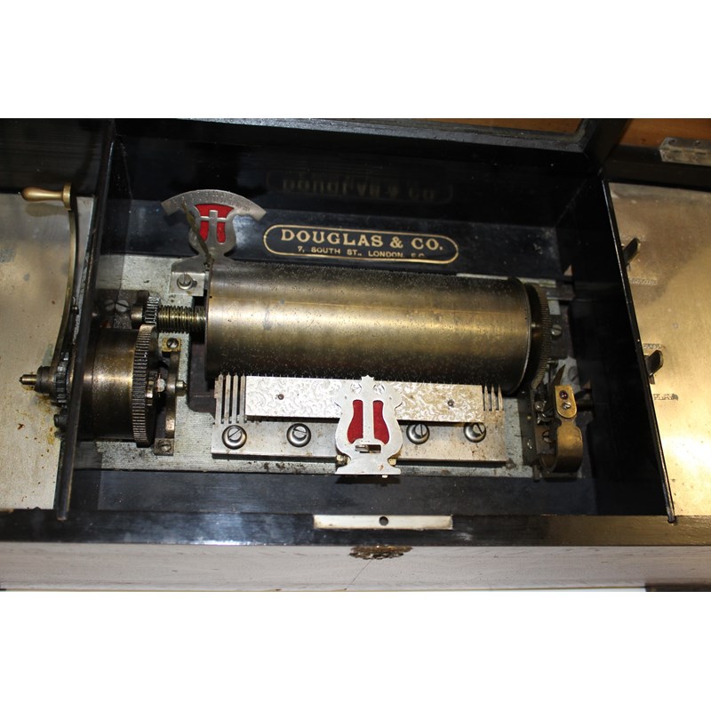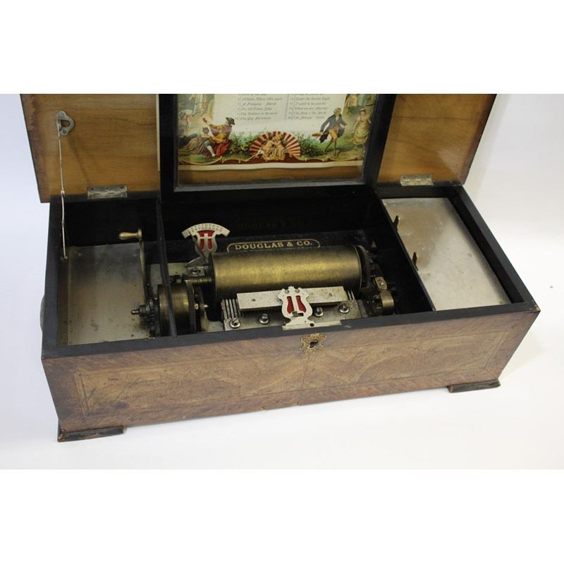 the large musical box with a 20 air movement, with start/stop and change/repeat levers. With a songsheet on the inside of the lid, marked for B H & A Ste Croix, Switzerland, also with a retailers plaque inside for Douglas & Co, London. The wooden case with carrying handles on each side. Mechanism in working order, all teeth intact with 1 tip missing. Case 61cms across, Cylinder 19.5cms long