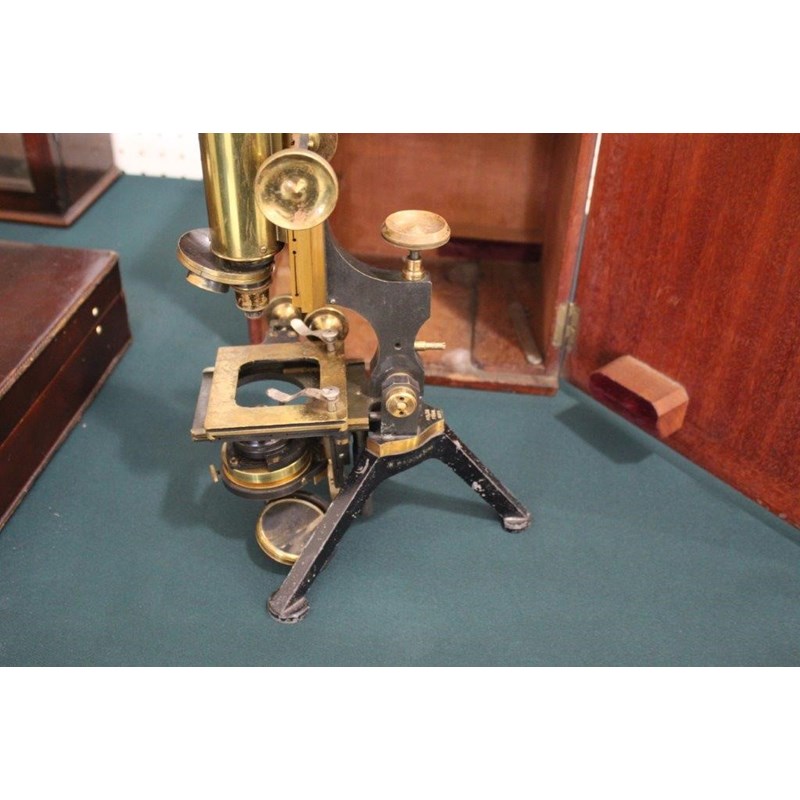 a brass and metal monocular microscope by W Watson & Sons, marked Holos Fram 10878 and in a fitted box with additional lenses. Also with a few microscope slides in a small box, including Shakspere painted by N Hilliard (microdot slide), and other vintage slides including makers such as Flatters & Garnett, Ward of Manchester, and E Wheeler.