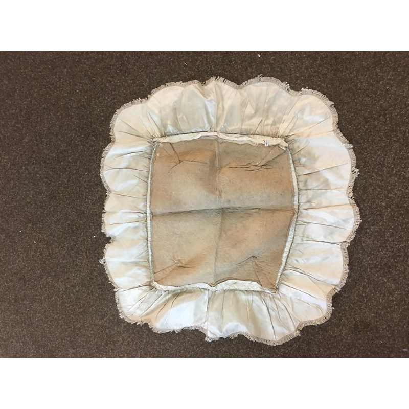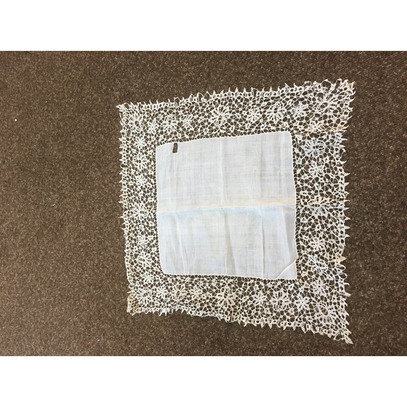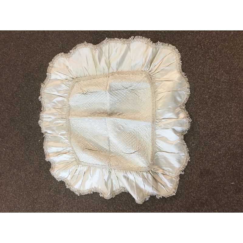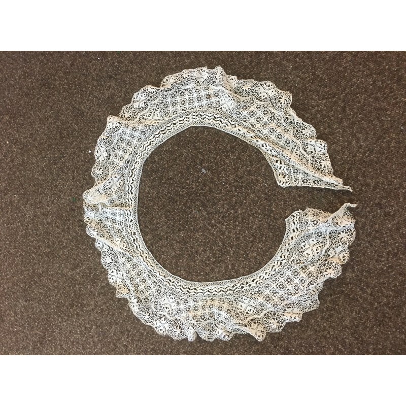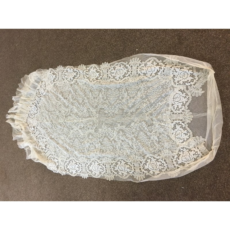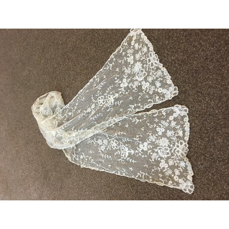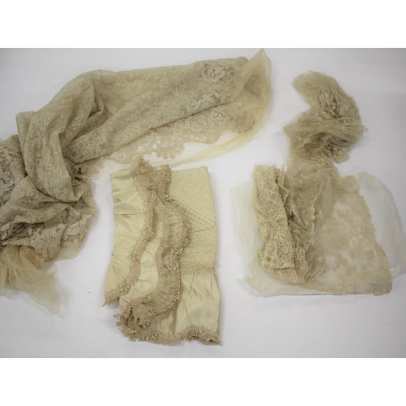19THC LACE STOLE a 19thc cream applique lace stole, also with a silk square edged with Irish cutwork, a Maltese lace collar, and a early 20thc ivory satin quilted cot cover and lace drape.