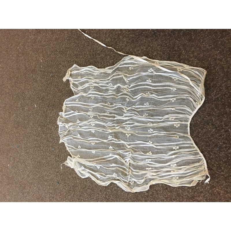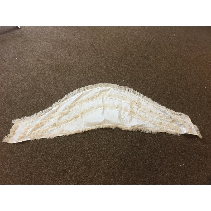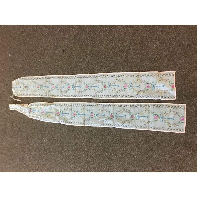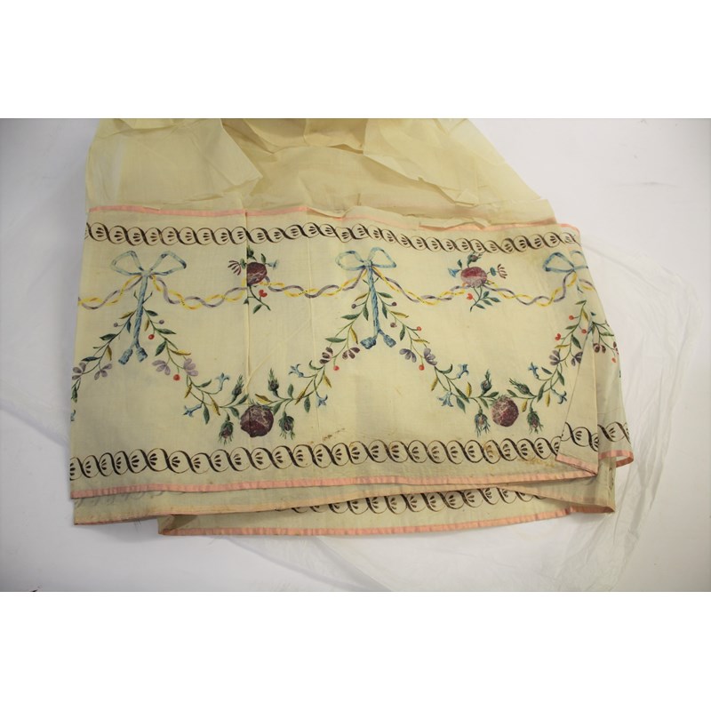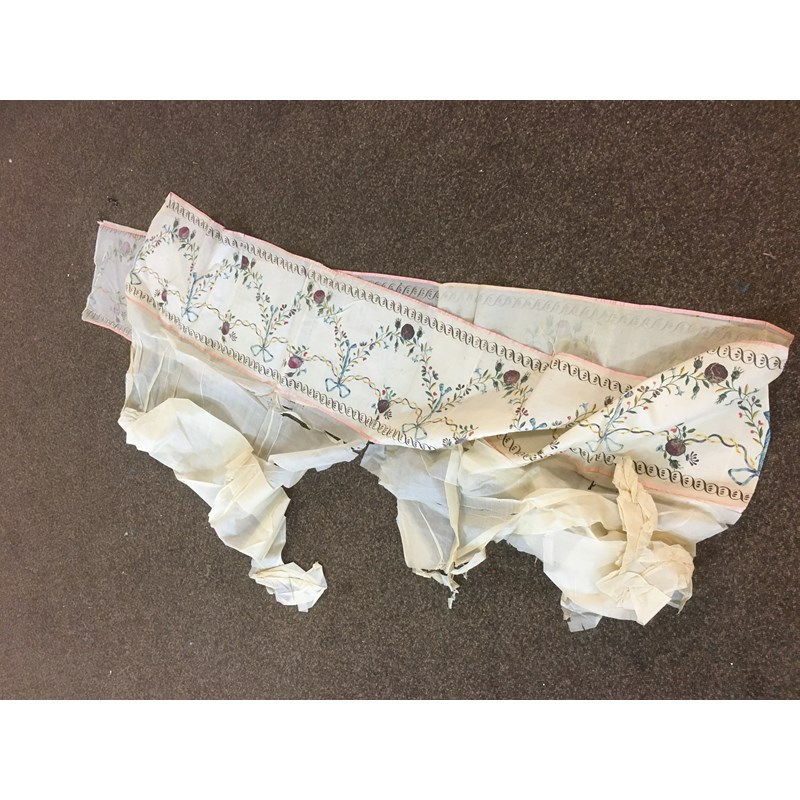 a fragile length of cream silk bordered with a hand painted design and trailing foliage and ribbons. Also with a pair of hand painted silk sashes edged with pink ribbon, a cream taffeta fringed shawl decorated with pleated ribbon, a striped cream stole and a fine cream silk apron.