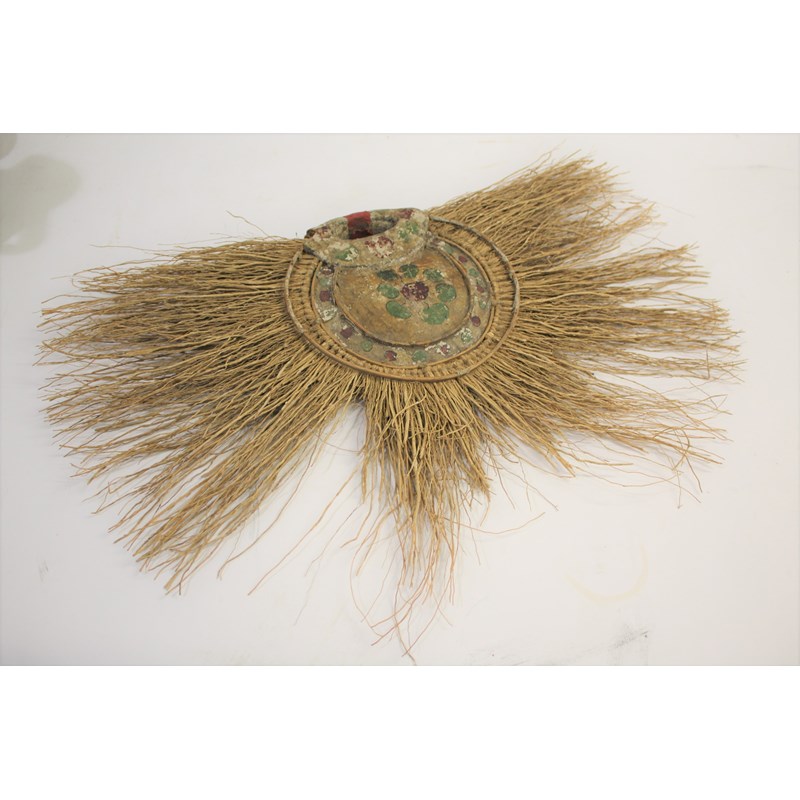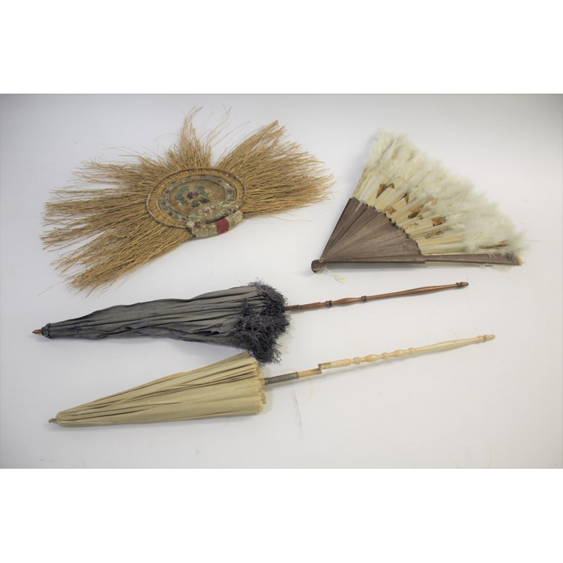including a tribal brushwood fan with hand painted decoration, a ostrich feather and wooden fan painted with Butterflies, and 2 silk parasols with folding wooden handles (both with extensive holes). (4)
