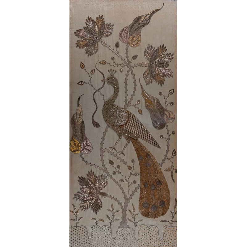a Zardozi embroidered panel with depictions of a Peacock, Snake, Tree and exotic flowers. Worked in pale pink and yellow silks, and silver and gold coloured metallic threads. Mounted and framed. Frame 129cms by 65cms